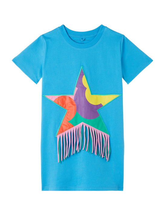 Colour: Light Blue Twill dress Crew neck, long puffy sleeves Elasticated cuffs Frill details at the chest, waist and hemline...