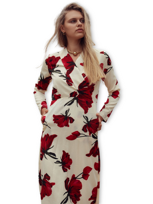 Description – The Profile Rose Elegance dress exudes timeless sophistication with its graceful cross neckline, long sleeves, and delicate rose print. Designed with an A-line skirt and an invisible zip closure, it offers a flawless fit and effortless elegance. Perfect for special occasions, this refined silhouette enhances movement and style, making it a must-have for any elegant wardrobe.