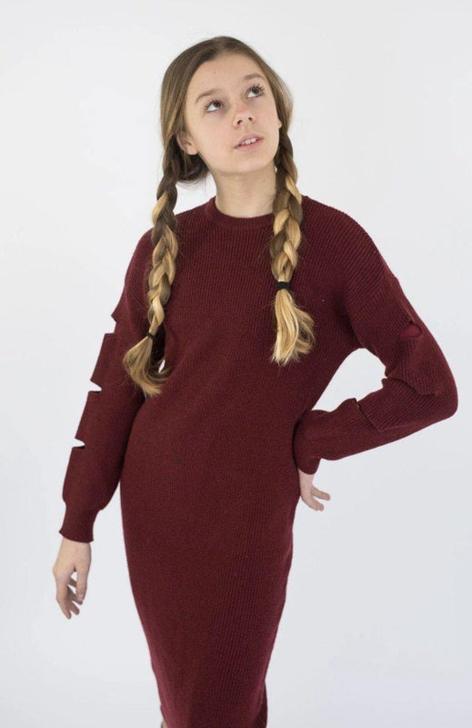 Knit pull on dress with cut out detail on sleeves and matching lining underneath