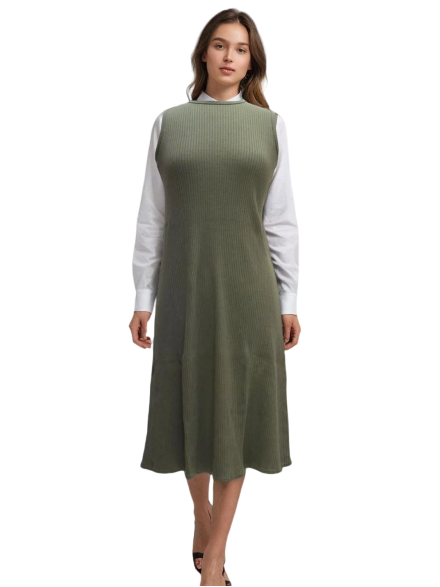 Long sleeve ribbed mid-dress. This round neck dress is a perfect outfit to dress up or down using statement pieces...
