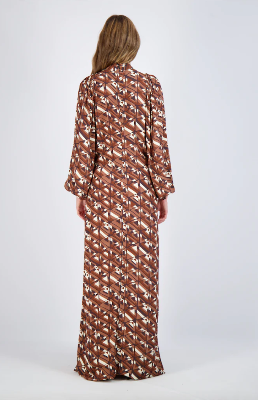 •LOOK: A rich warm palette of blues and burgundies create the backdrop for this maxi length long sleeve dress. Workable...