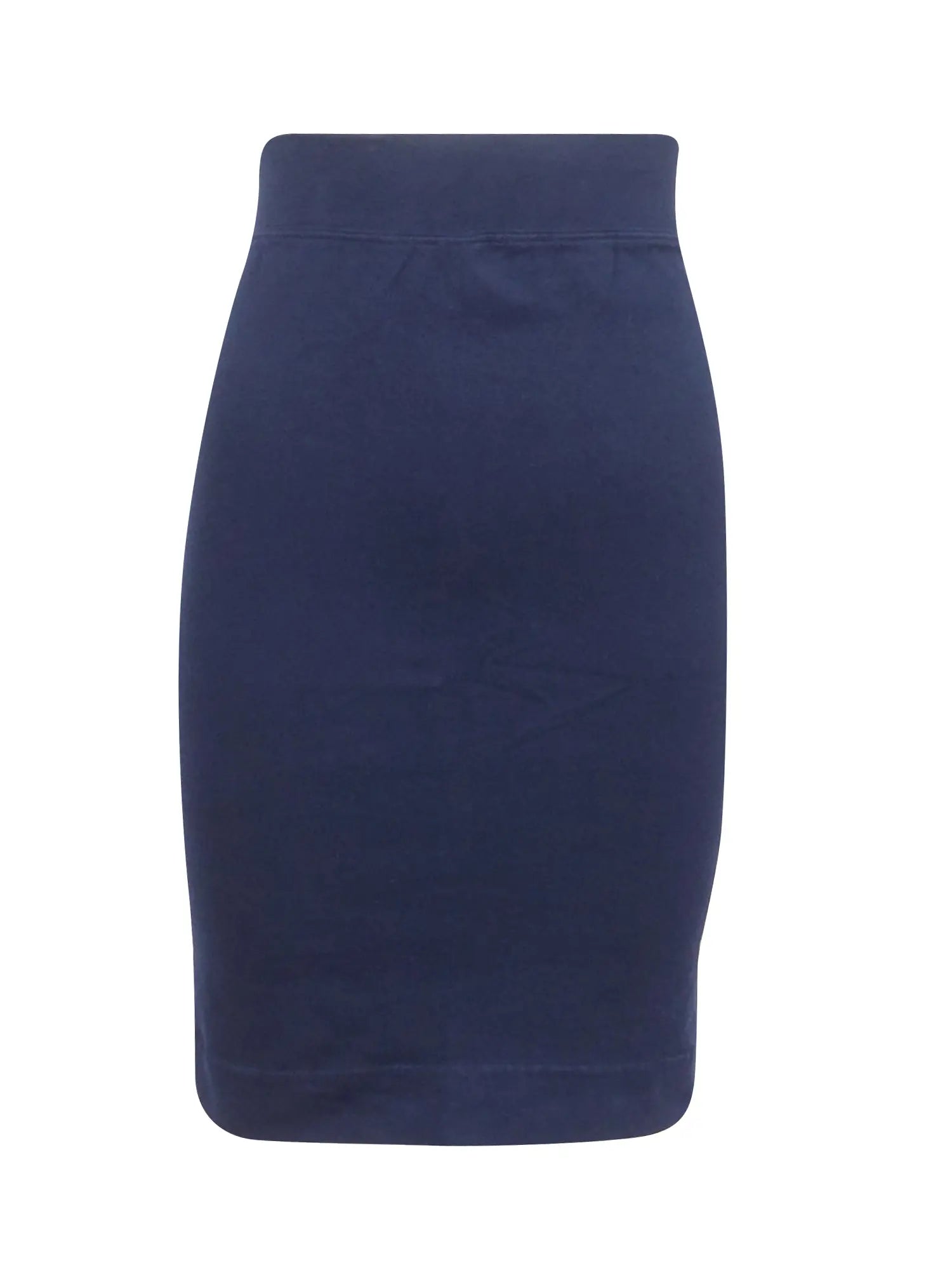 Cotton stretch denim pencil skirt with double back pockets, runs true to size, length hits just at knee.