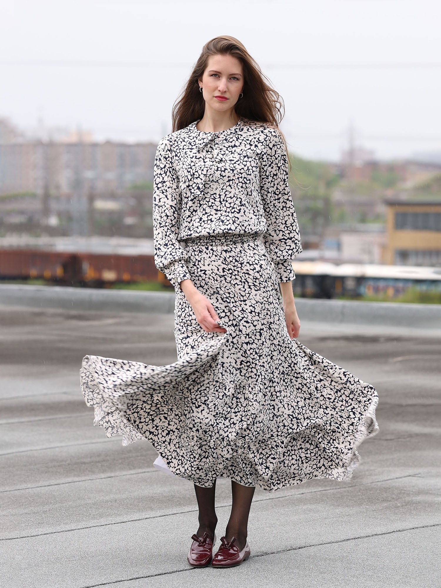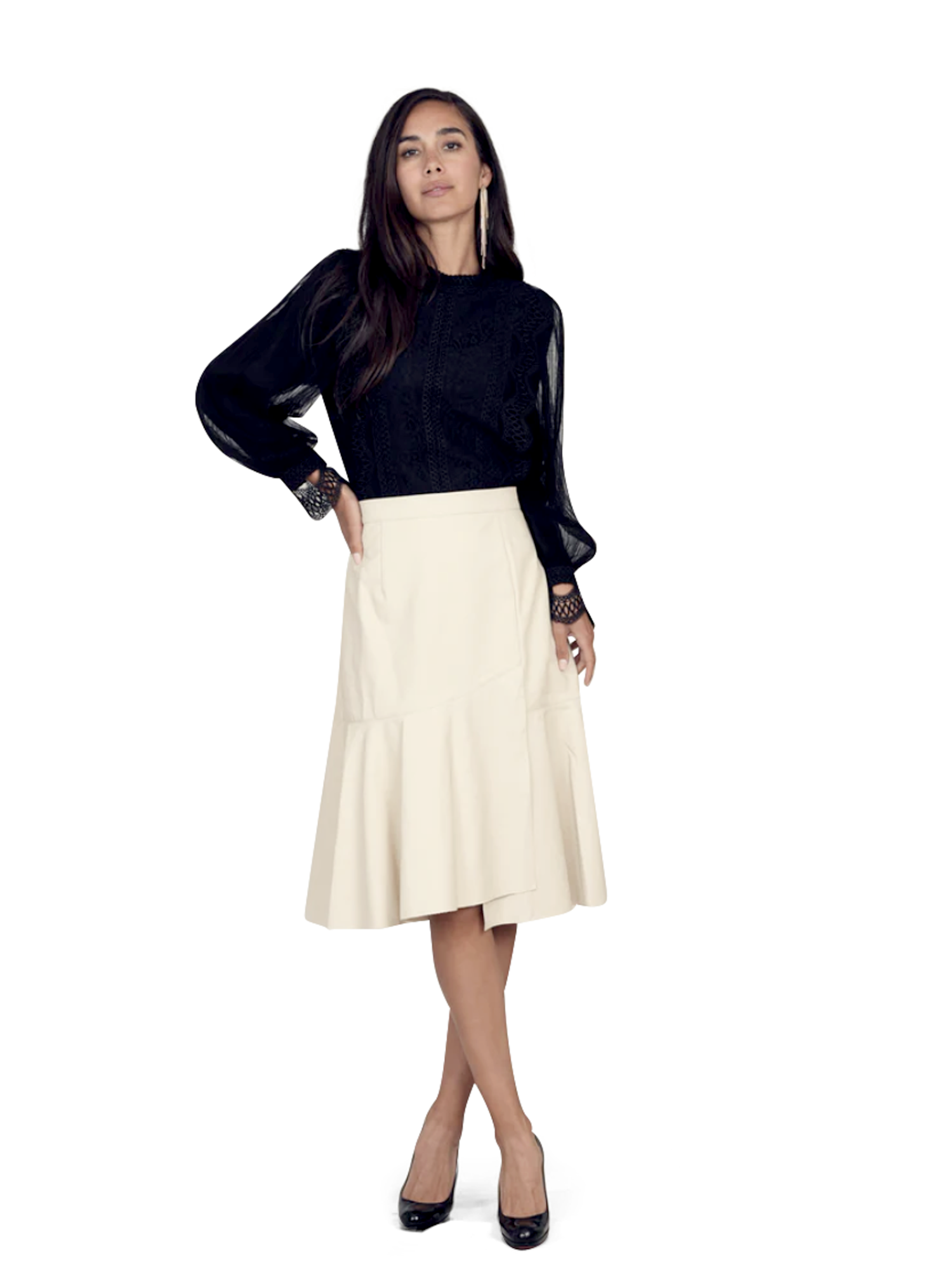 Crewneck long sleeve dressy top with diagonal flowy bottom
