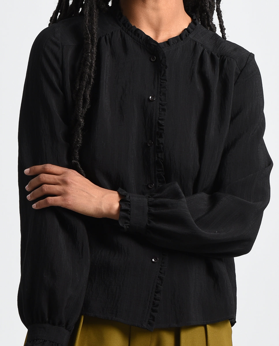 •LOOK: Sweet, subtle and stylish. This button down blouse with feminine ruffles slightly peeking through the placket and gently framing the...