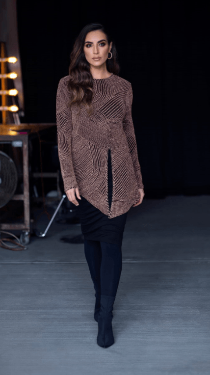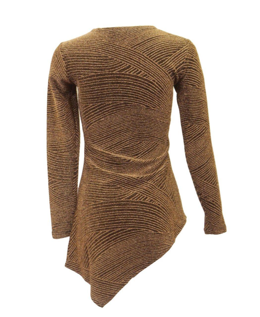 Metallic bronze long sleeve top with a high crewneck and high-low bottom hem.