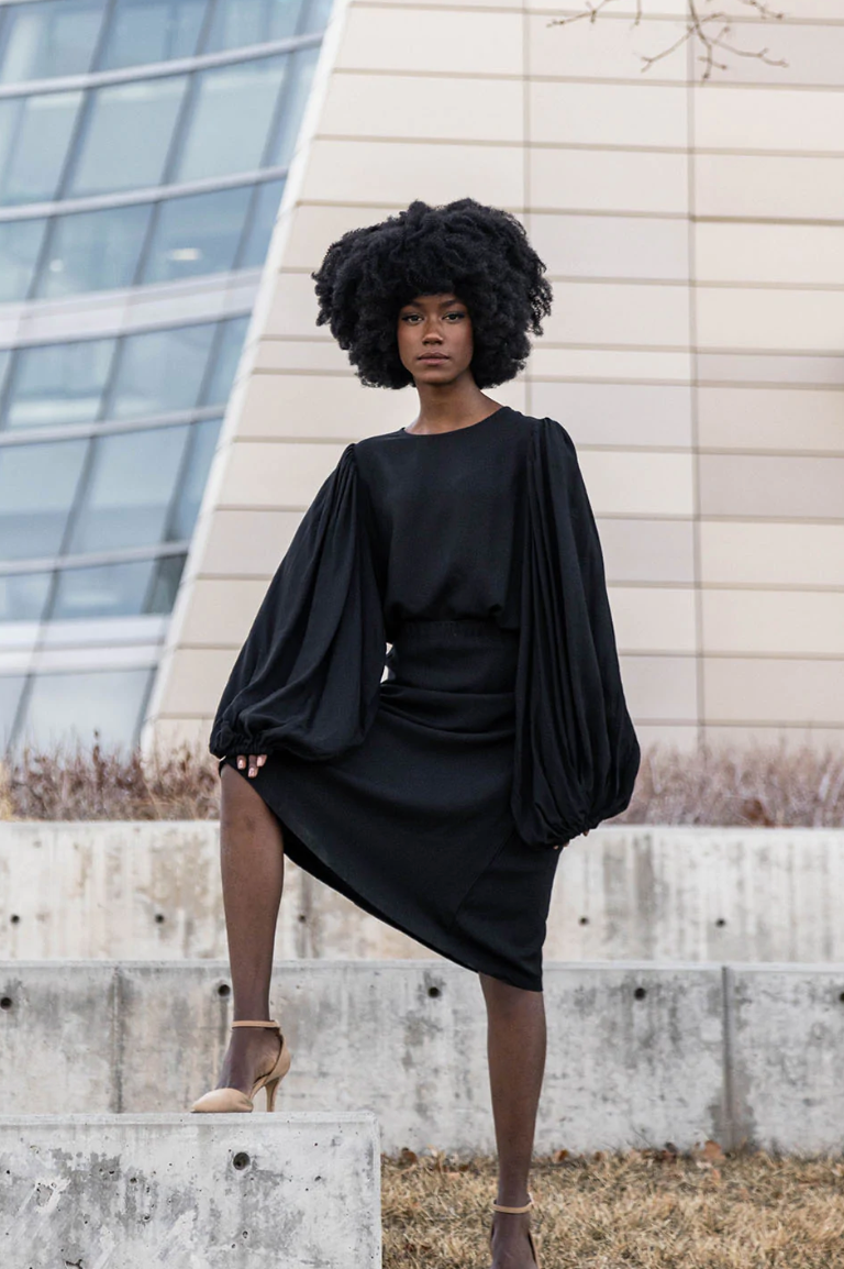 Black pleated tunic, short front with long sides and back