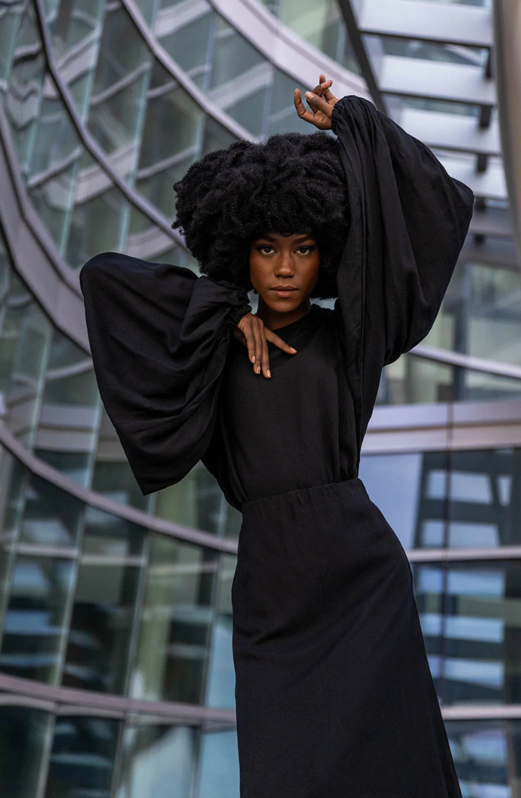 Crew neck Long dramatic sleeves Elastic on wrist Button on the back for easy wearing Fabric 100% Viscose (not a stretchy fabric)...