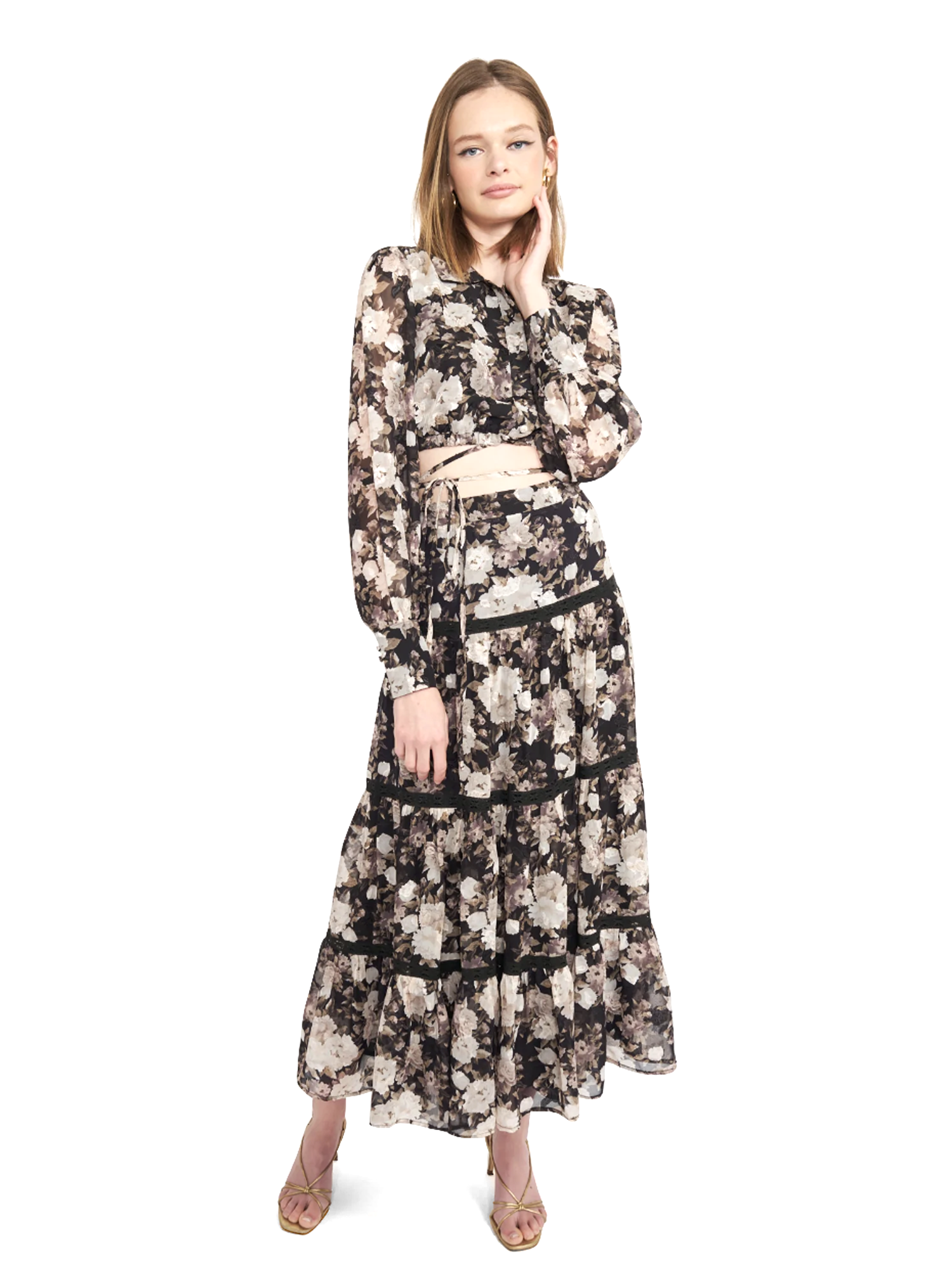BCBG crop top abstract brushstrokes design with metallic shimmer. Matching skirt available.