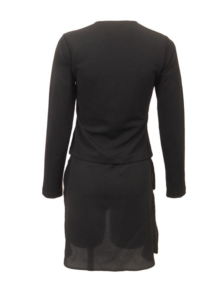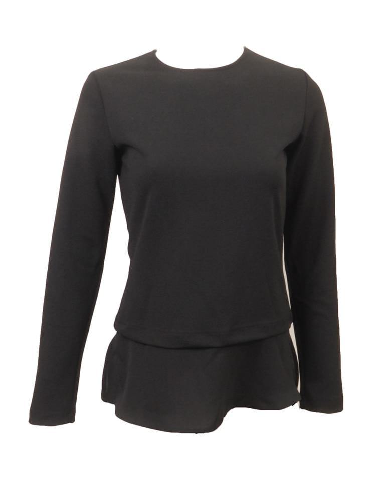 Black long sleeve knit stretch with dramatic hi-lo with split sides. Crew-neckline, fitted top.