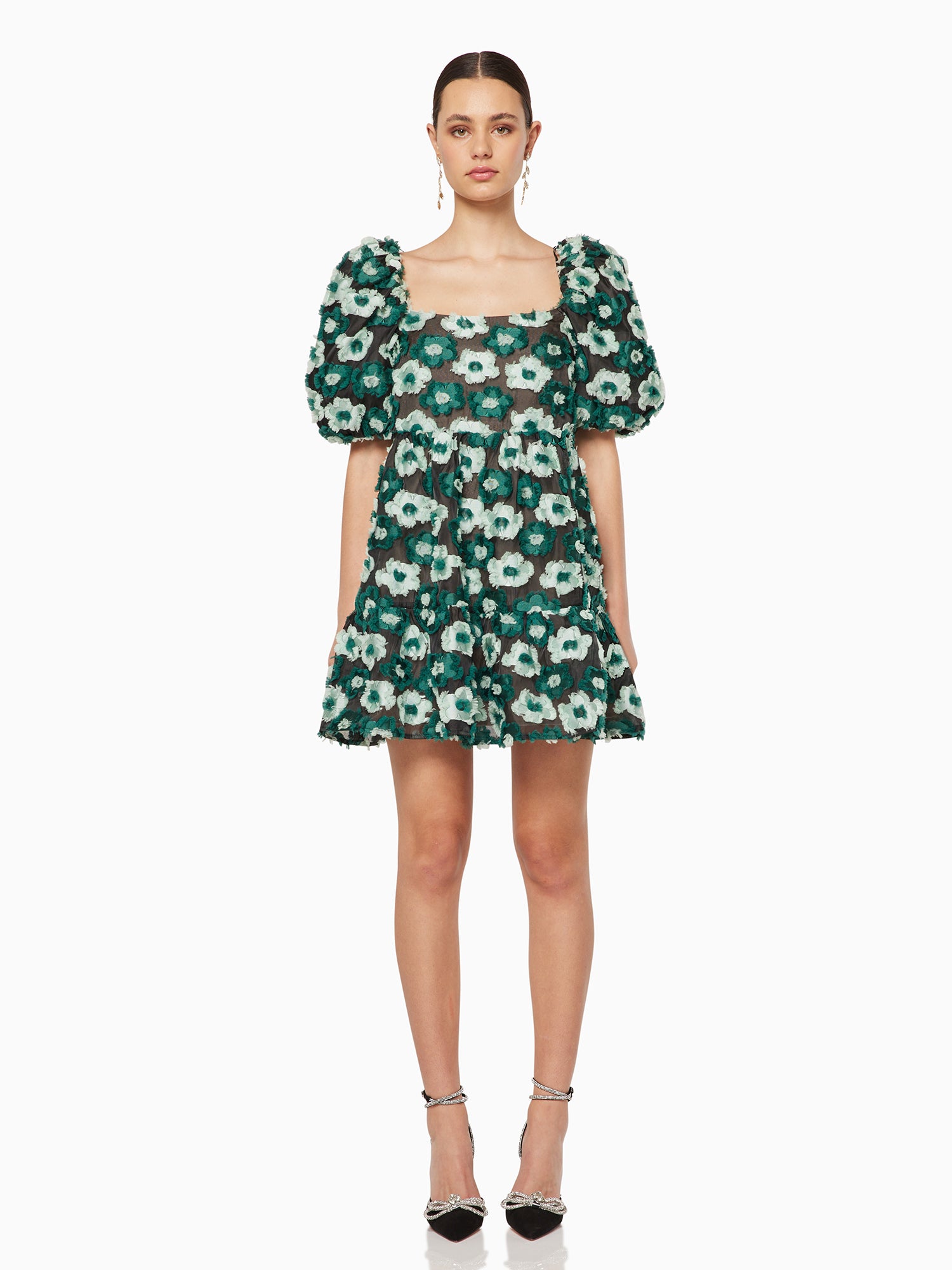 •LOOK: New from Elliatt is a midi dress with an embroidered floral overlay. It has a V neck with tie...