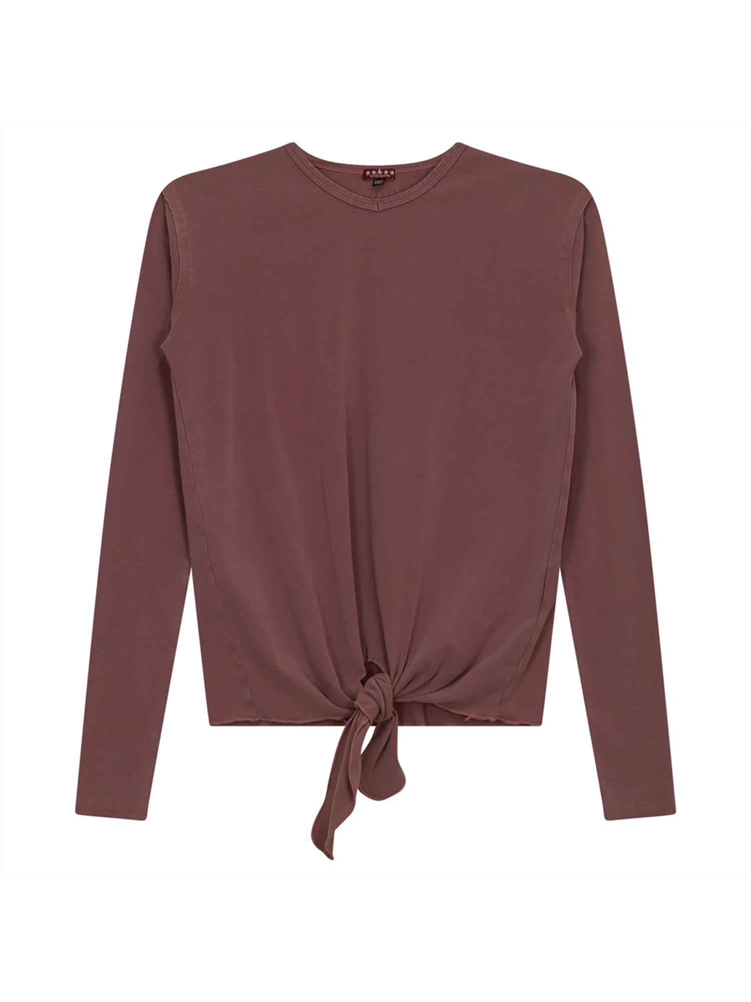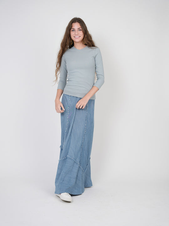 Long sleeve crewneck ribbed tee with lettuce hem Matching skirt available