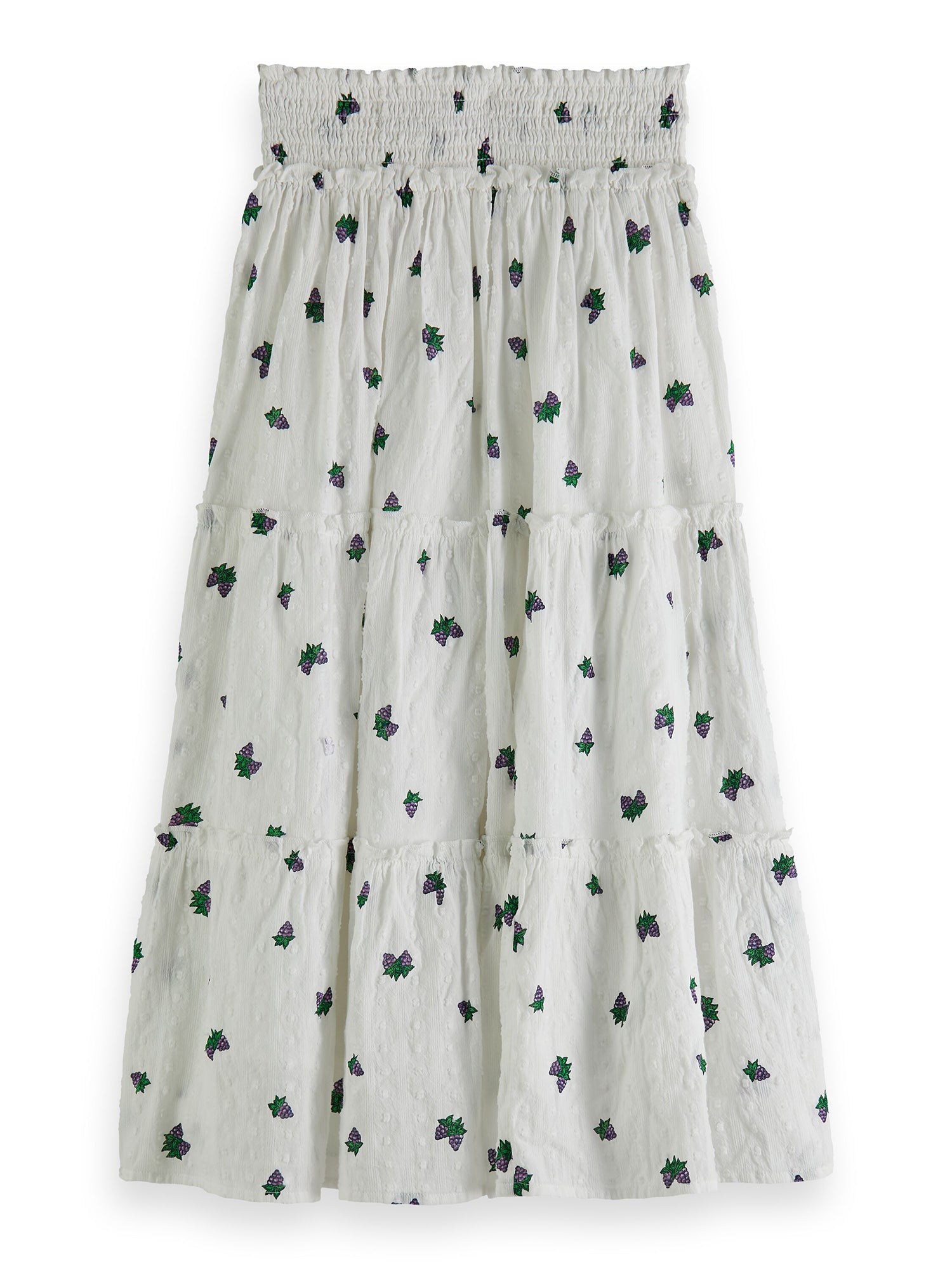 Details : Long skirt, elasticated waistband, double yoke, fluid. COMPOSITION: 97% cotton 3% lurex