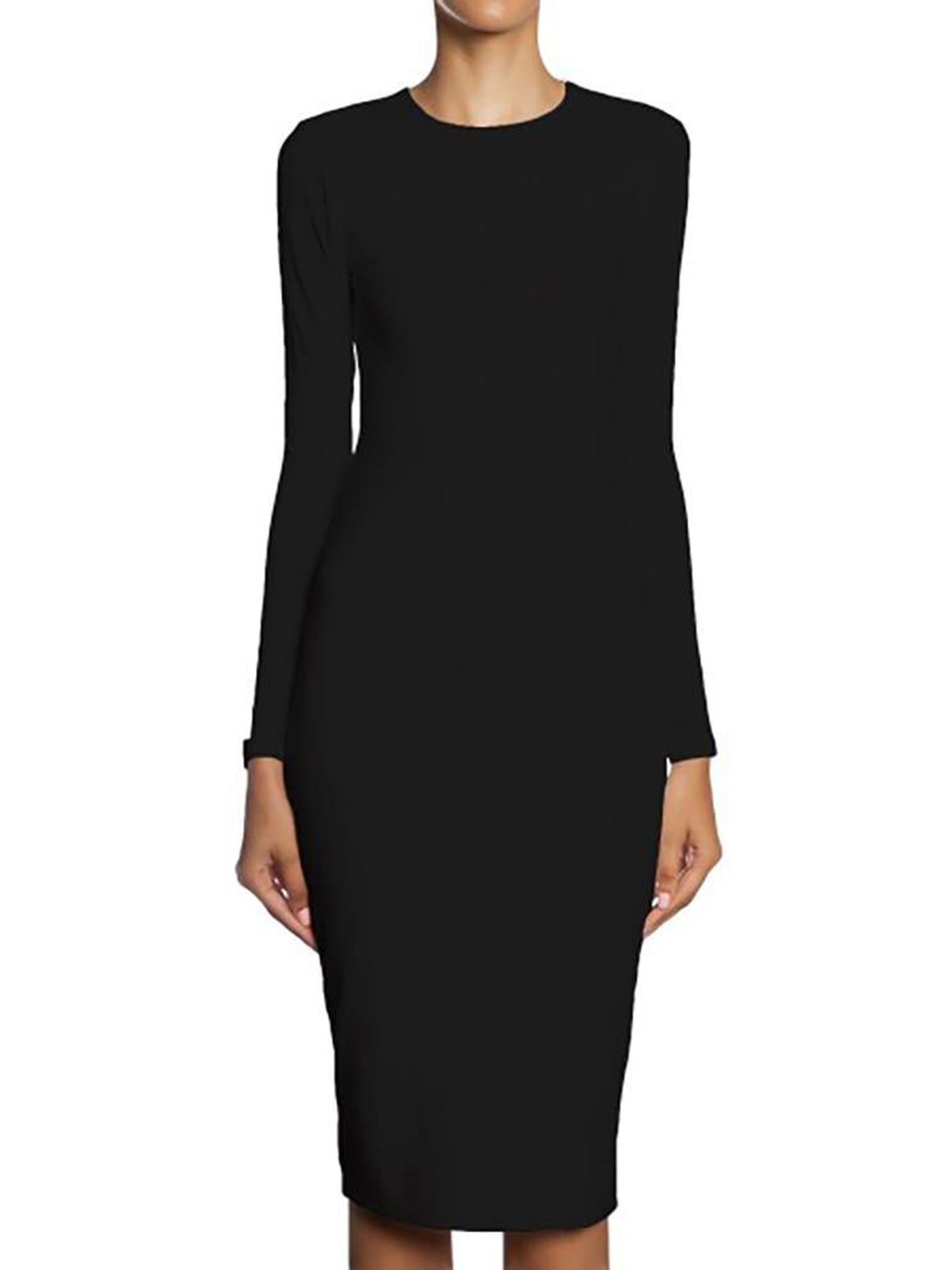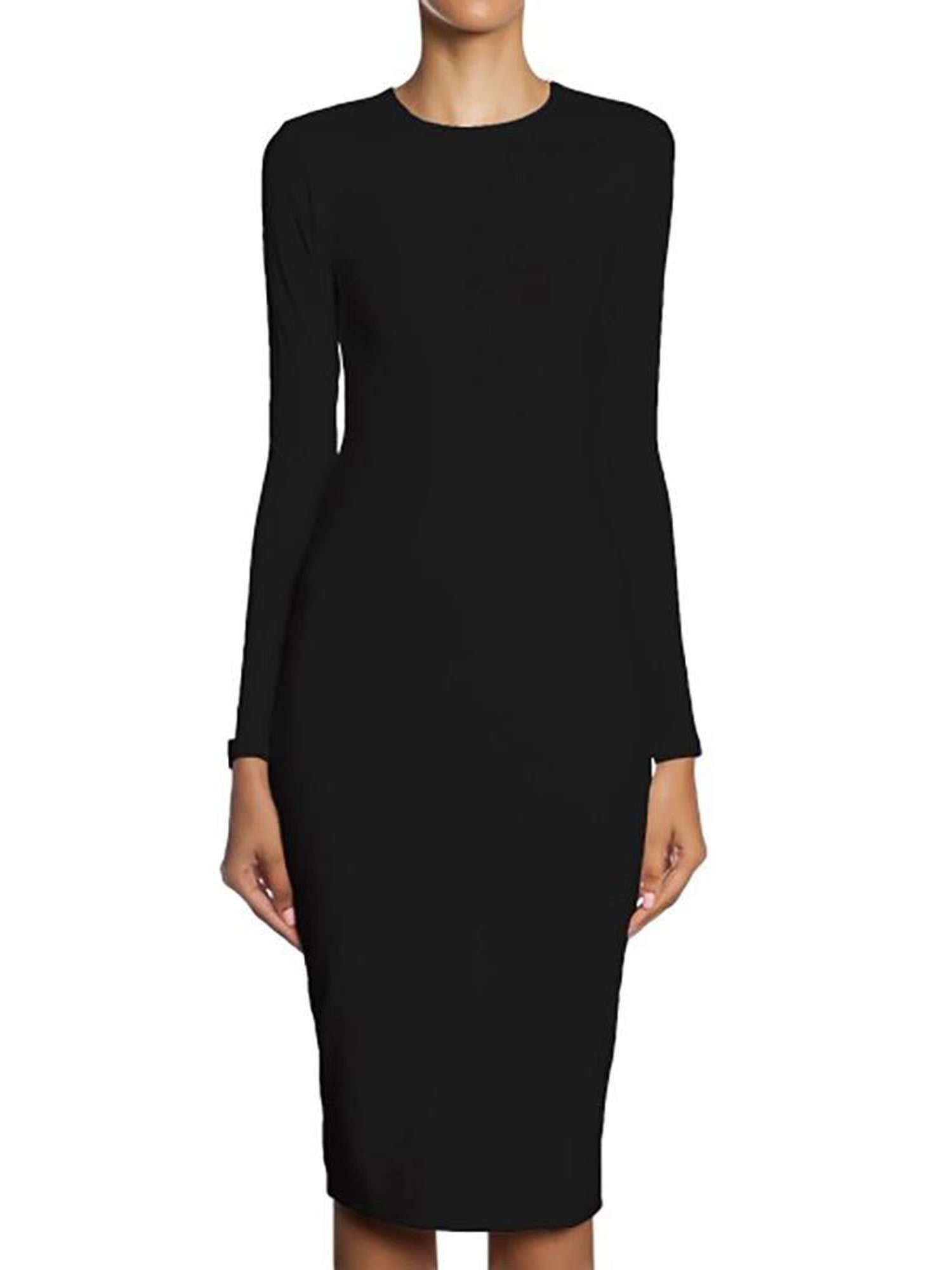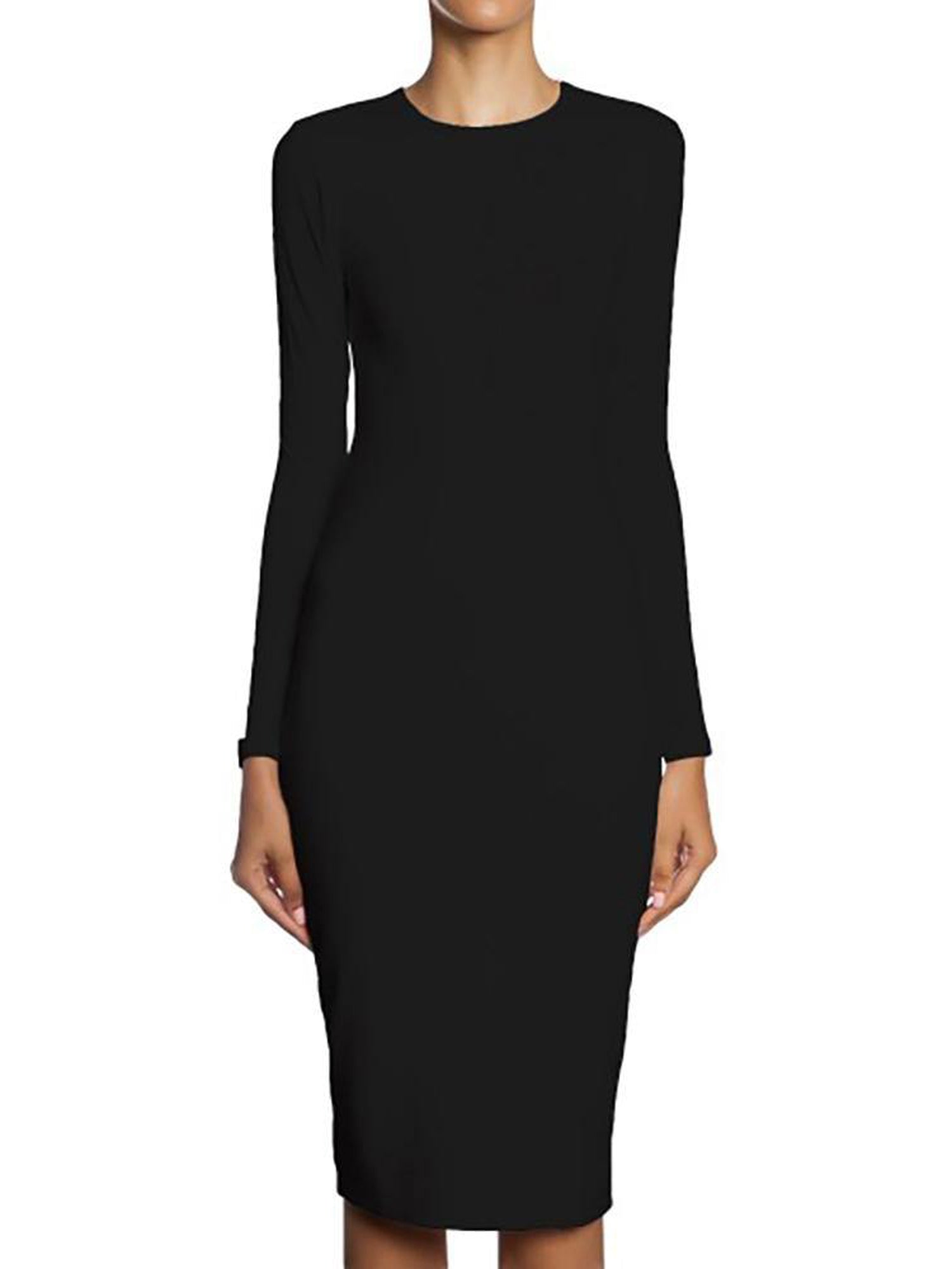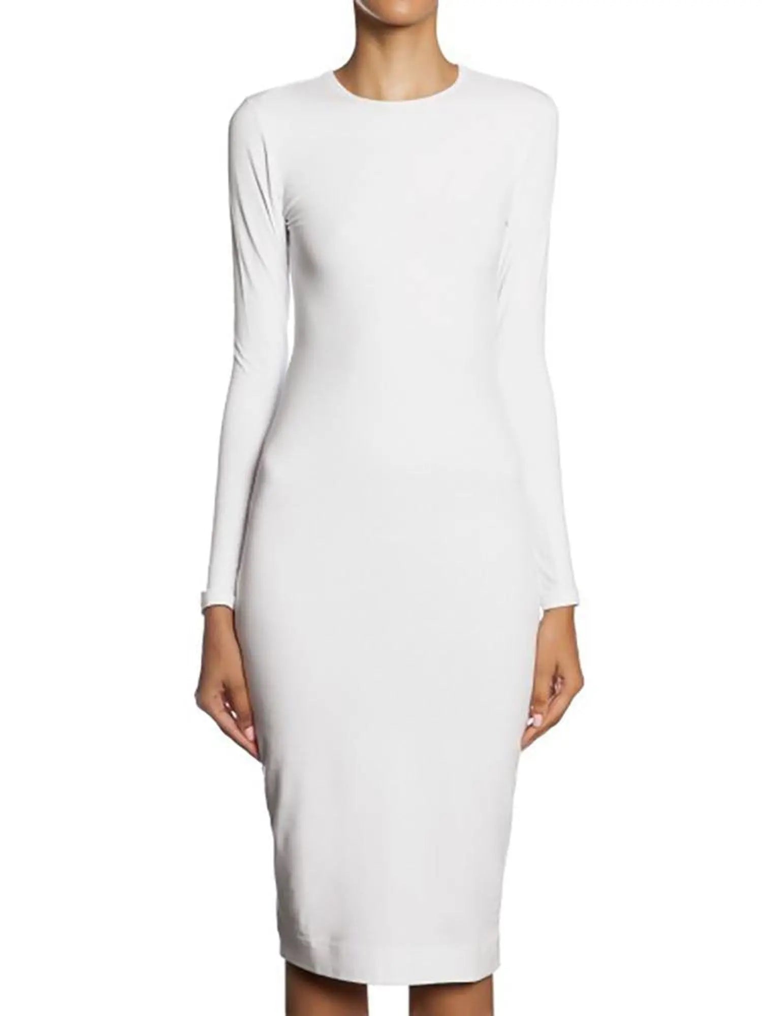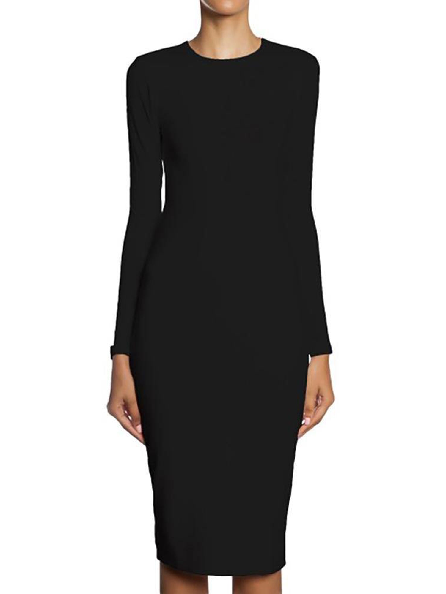 Nylon material pencil dress, long sleeve, crewneck. Runs fitted. Great for layering or as a comfy dress. Style: 7739