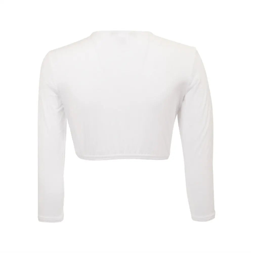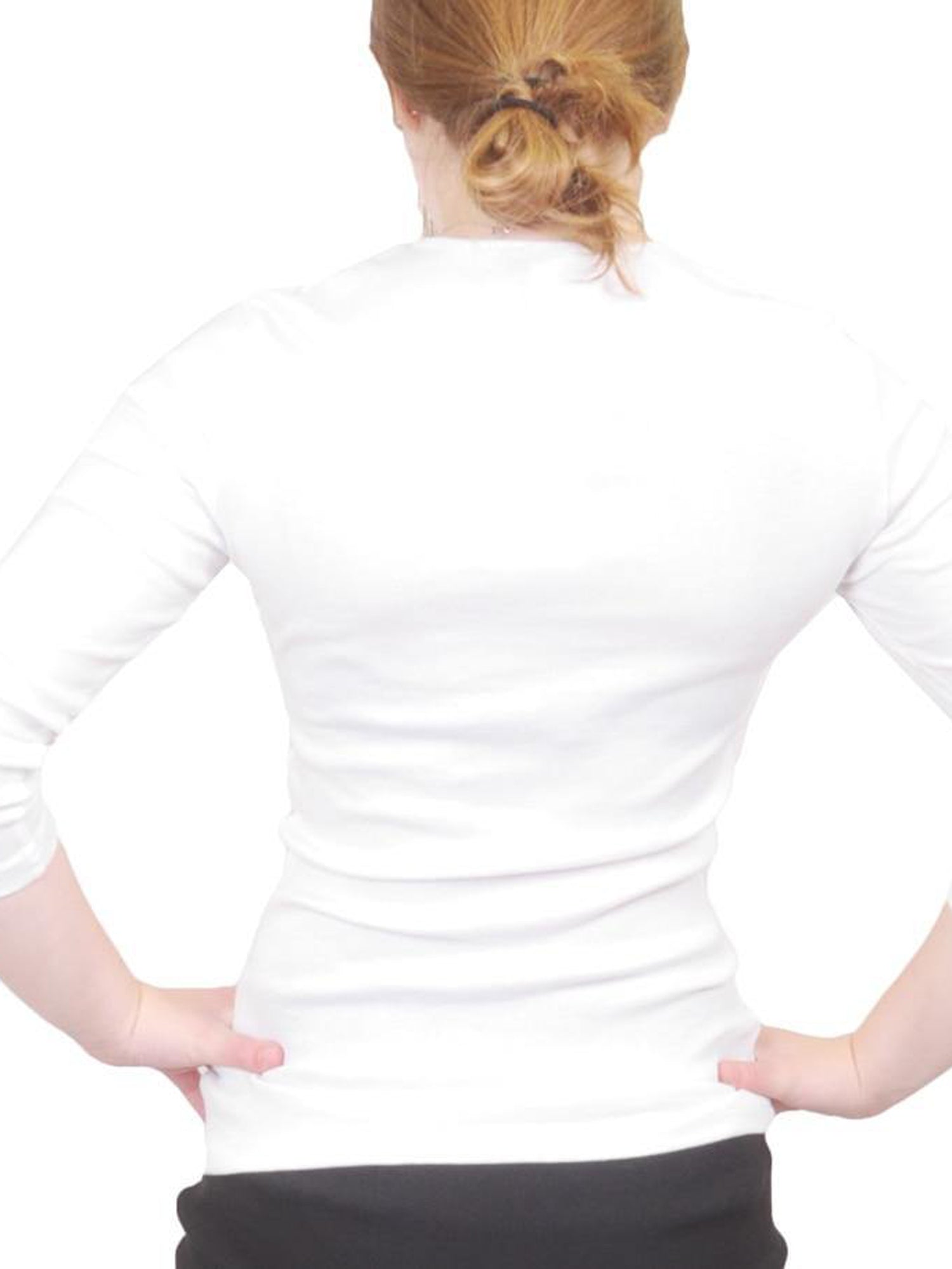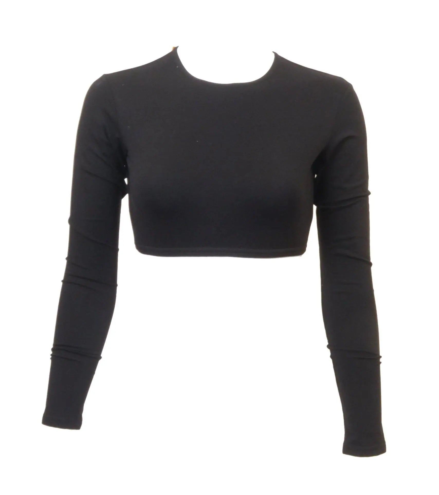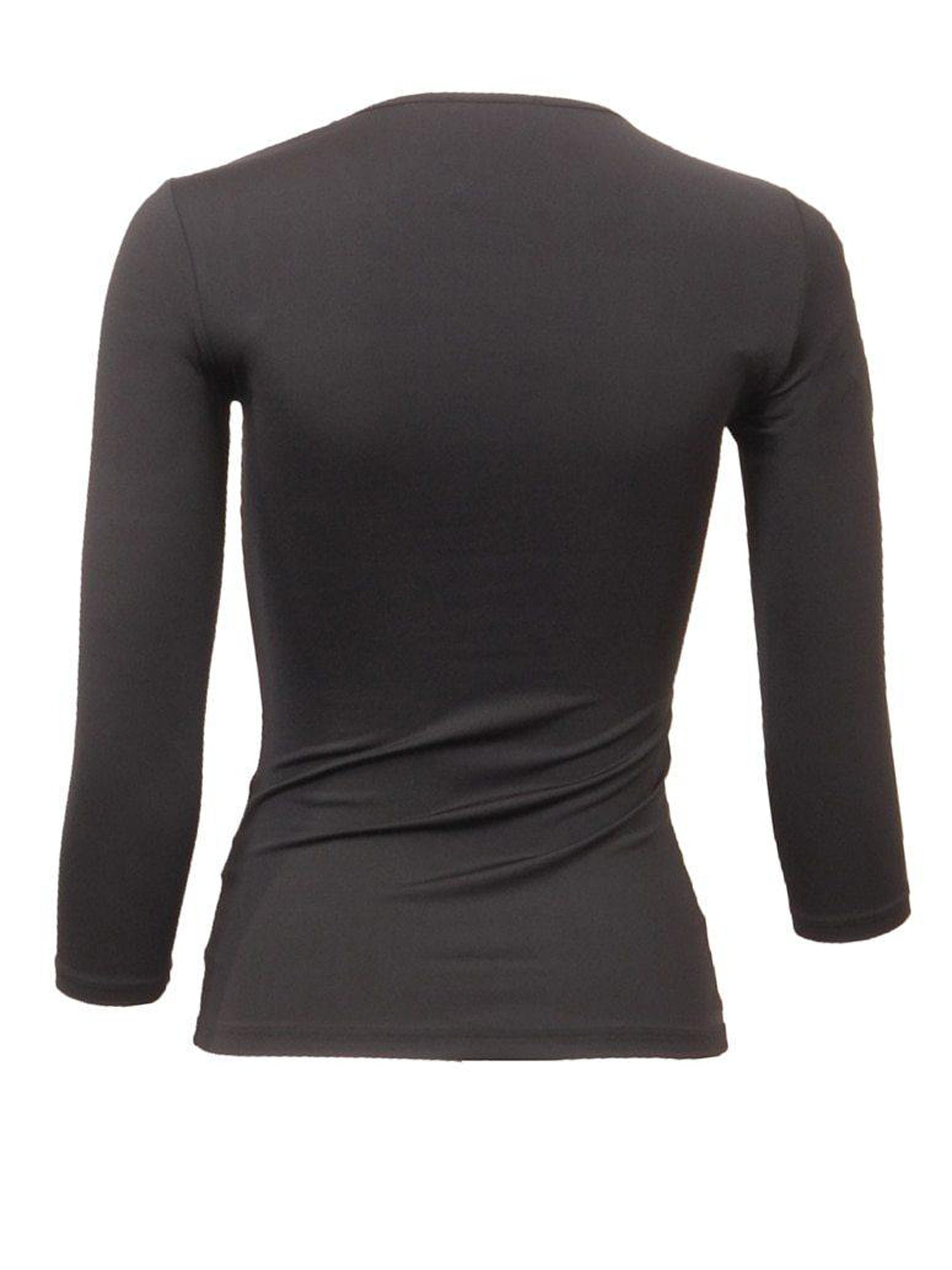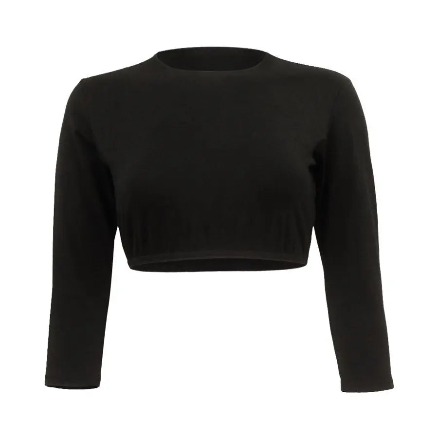 Cropped 3/4 sleeve shell Style: 14916 90% cotton/ 10% spandex Thin elastic band under bra Maximum coverage, minimum fabric Perfect shirt...