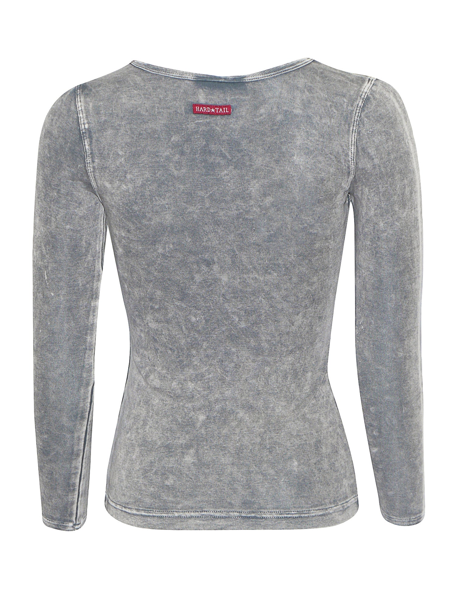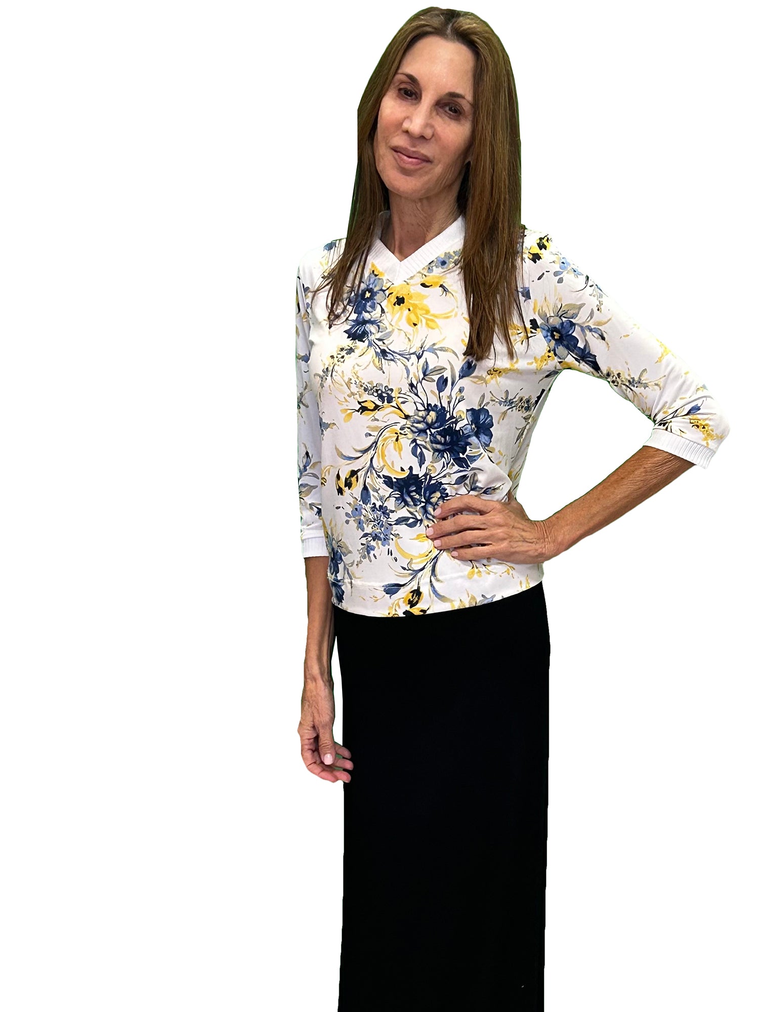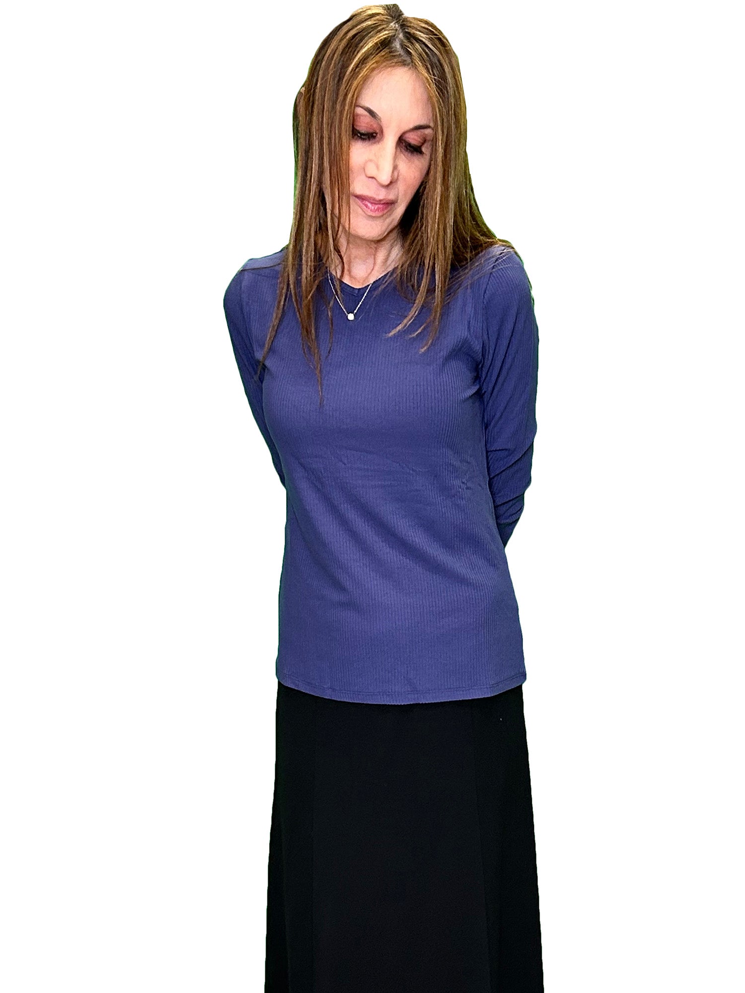Ribbed 3/4 sleeve t-shirt with high v-neck Machine wash cold 92.5% Polyester 7.5% Spandex