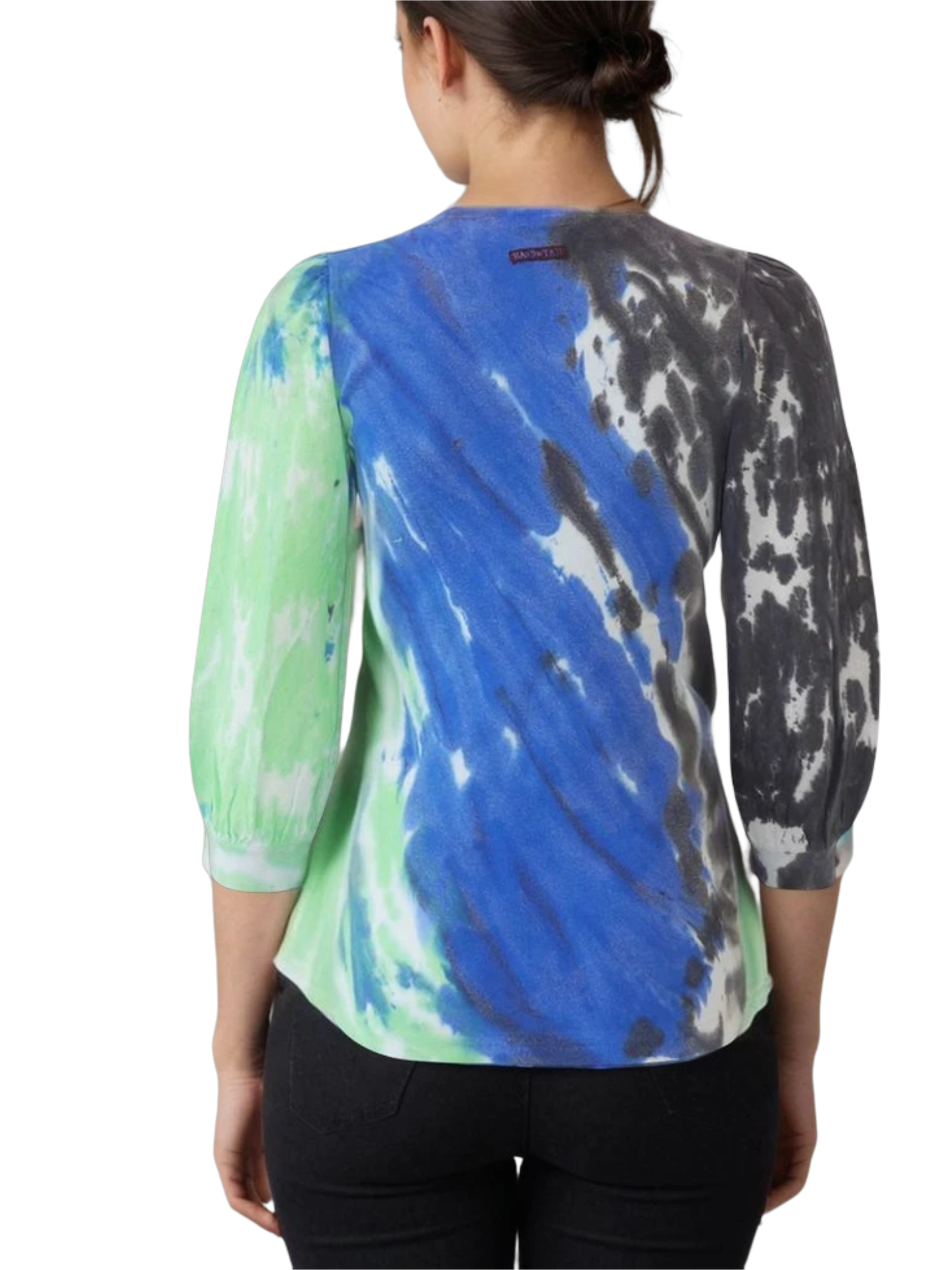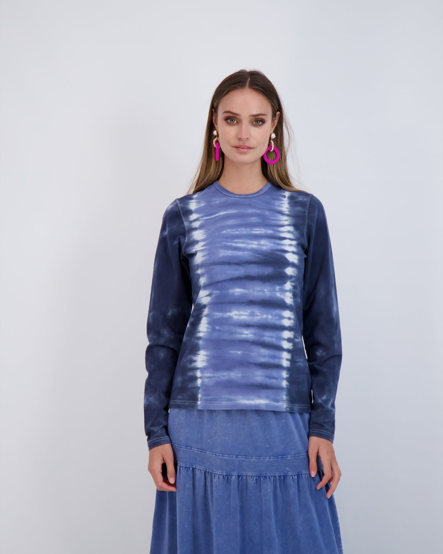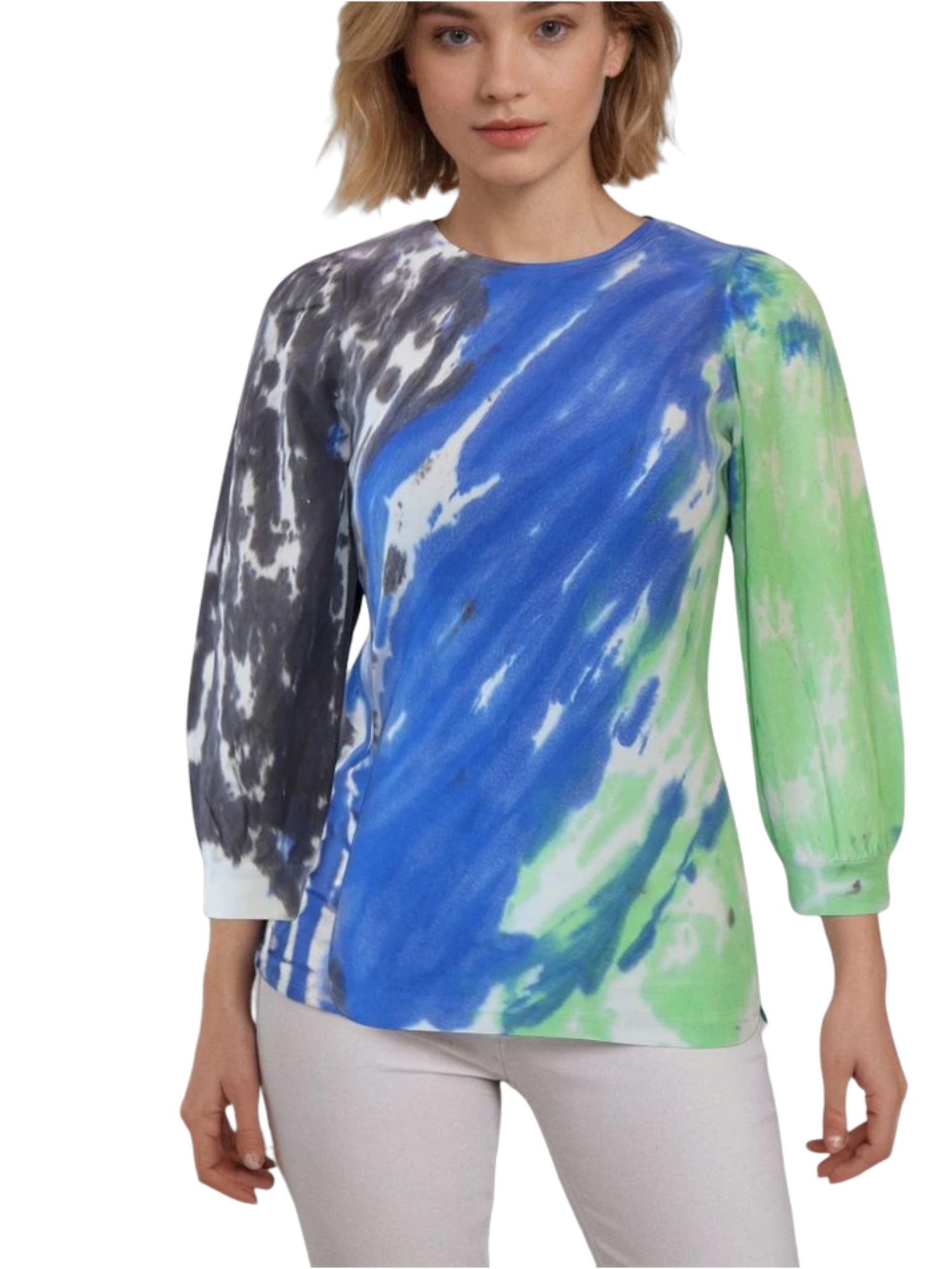 Crewneck top with colorful print fabric, loose-fit and longer in the back