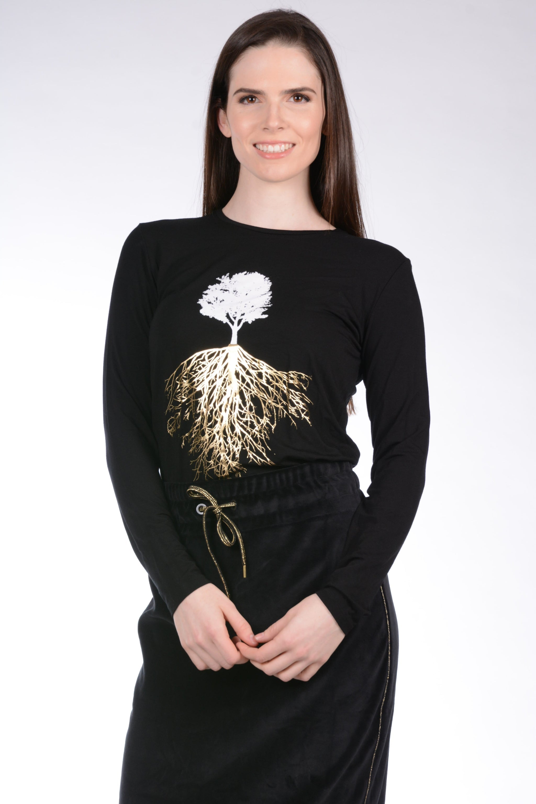 A black graphic t-shirt with a white tree and gold roots is a visually striking and symbolic garment. The t-shirt...