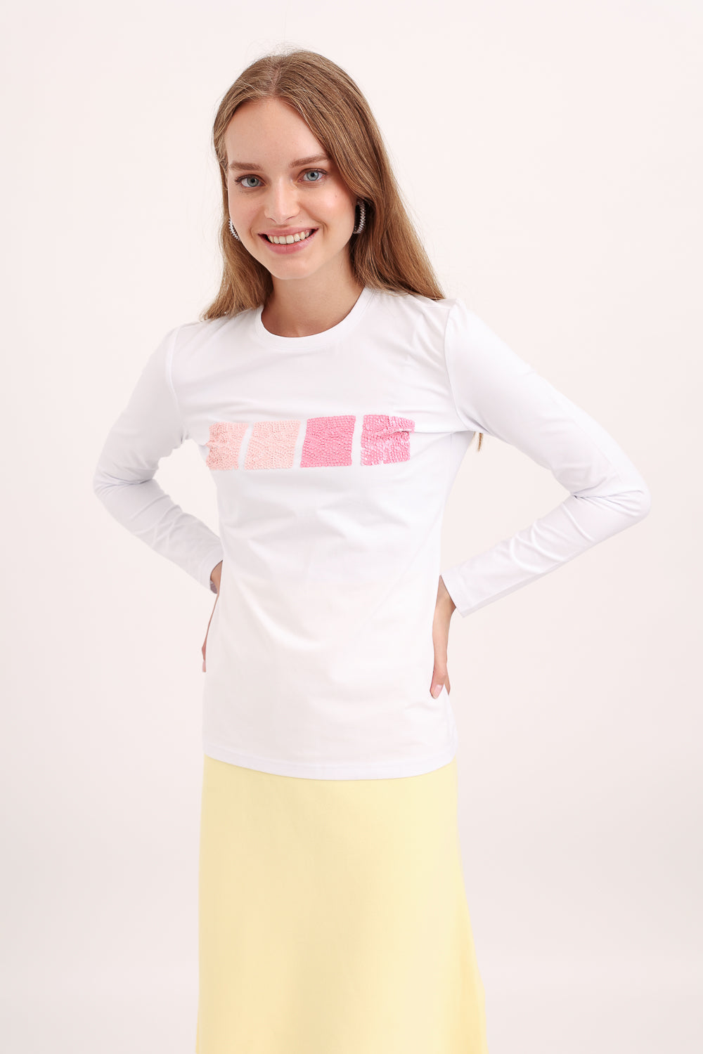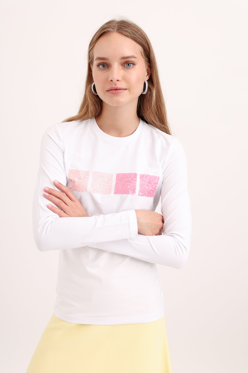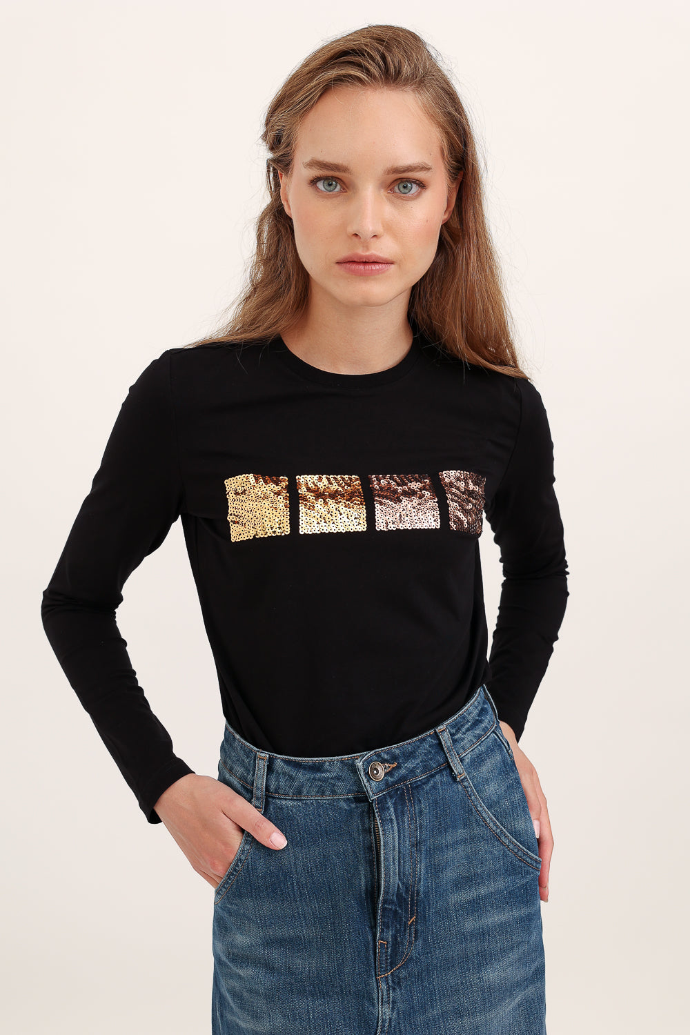 Crewneck long sleeve shirt with sequin design 94% Cotton 6% Spandex Machine wash inside out