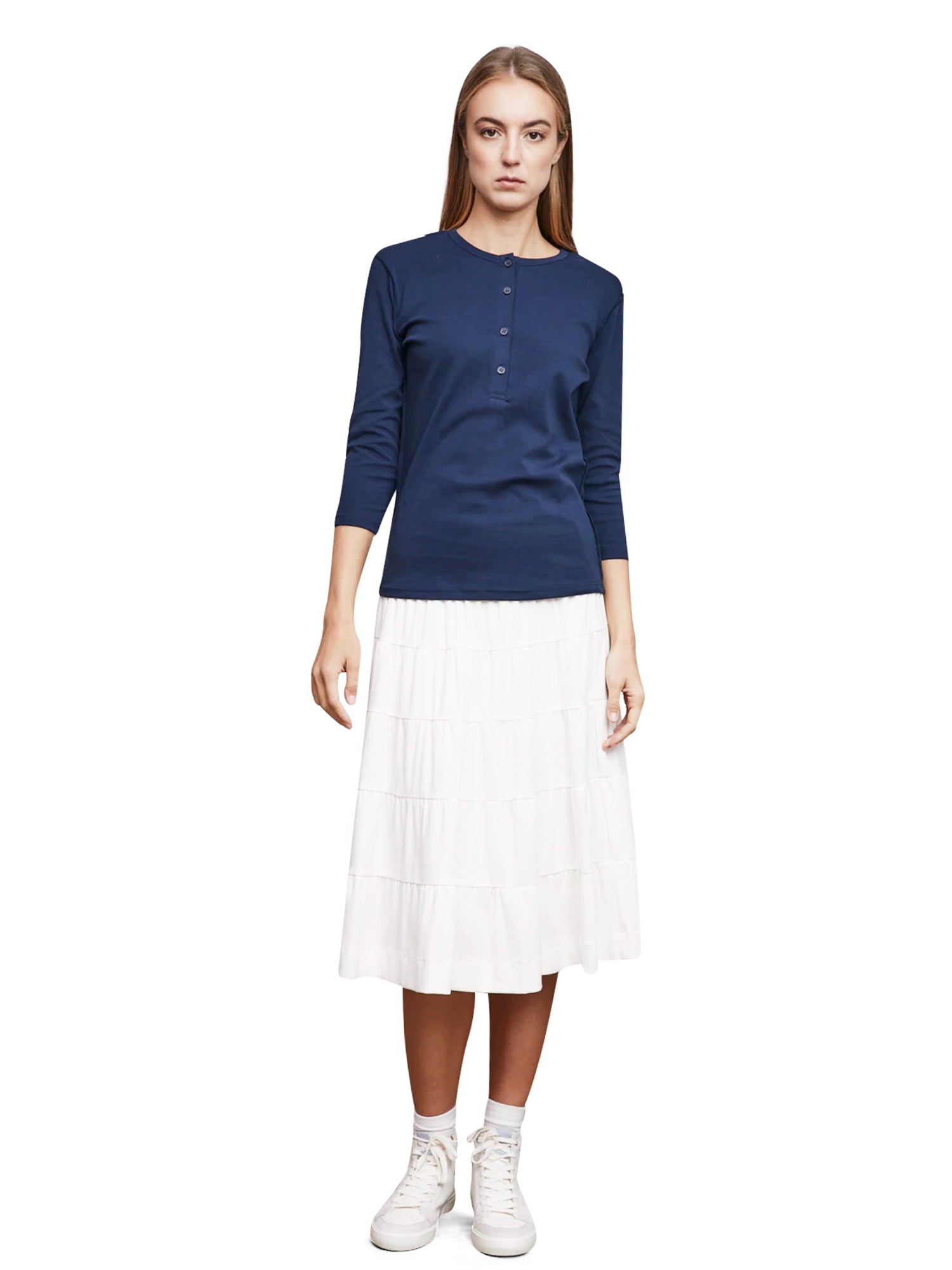 Crewneck 3/4 sleeve tee with exposed stitching Matching skirt available Plus Sizes: 0-3