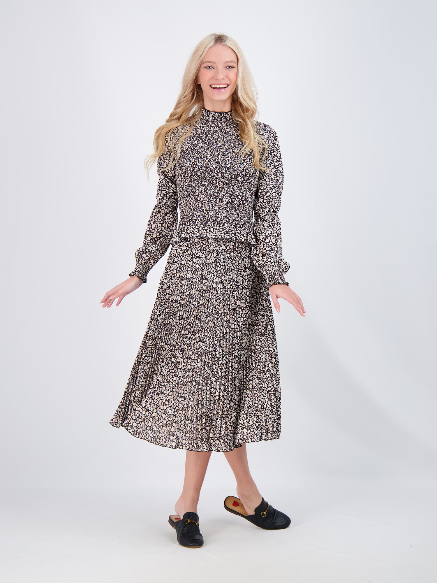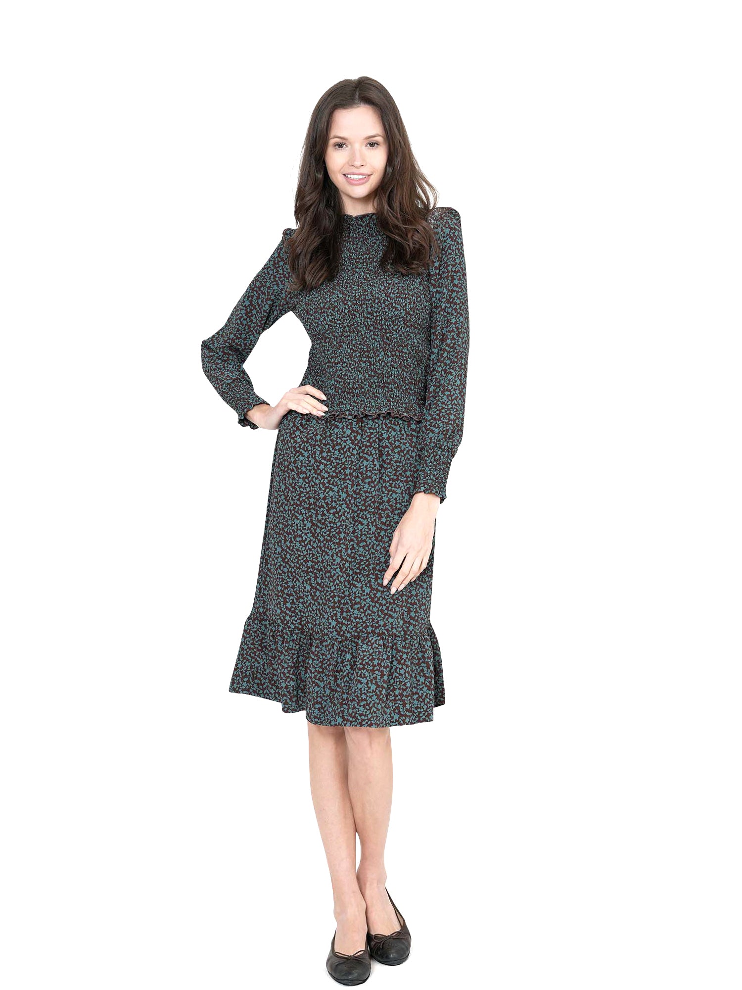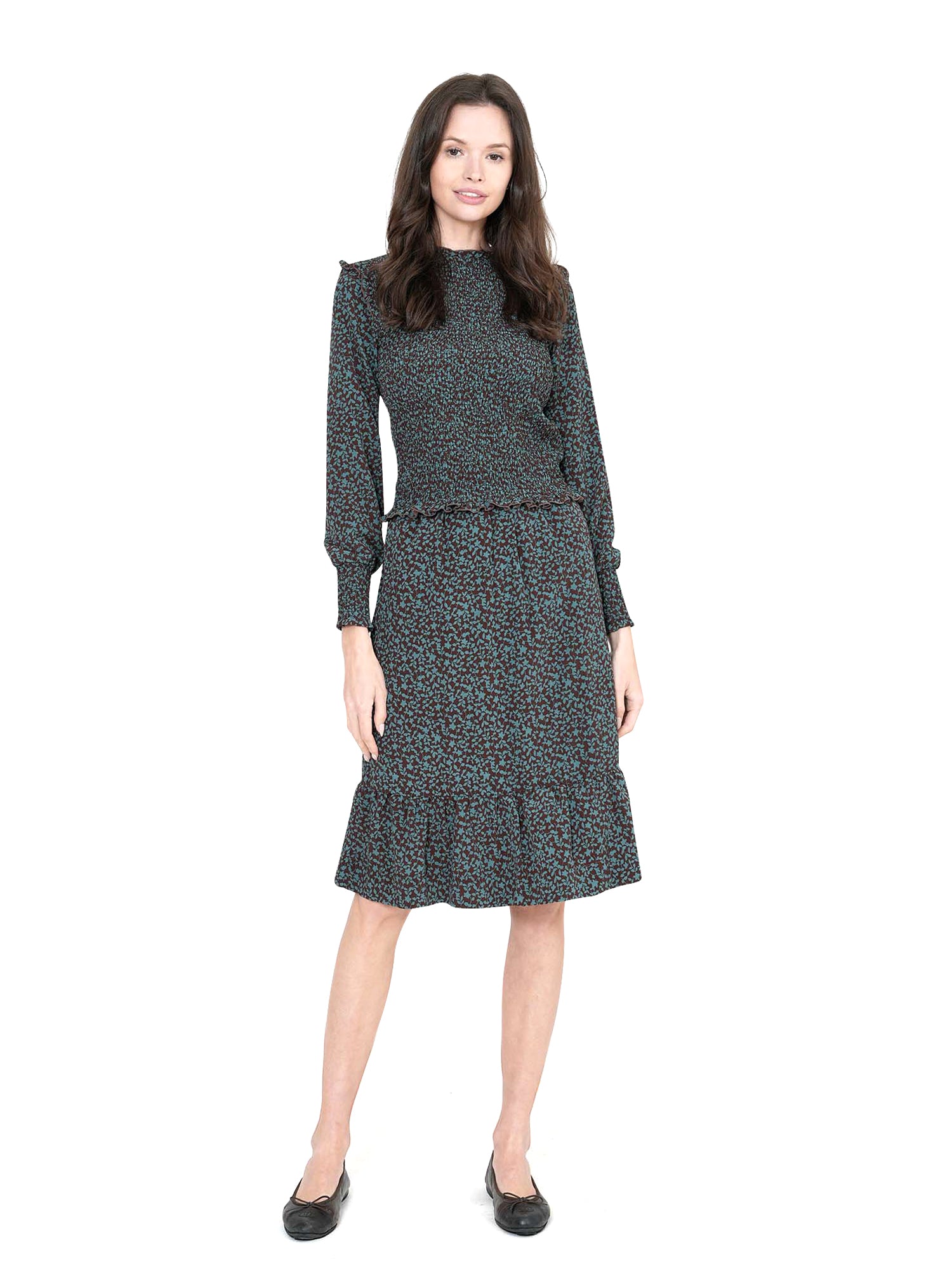 – Sold OutFloral smocked top with ruffle neck and back zipper Matching skirt available 100% Polyester Machine wash cold inside out