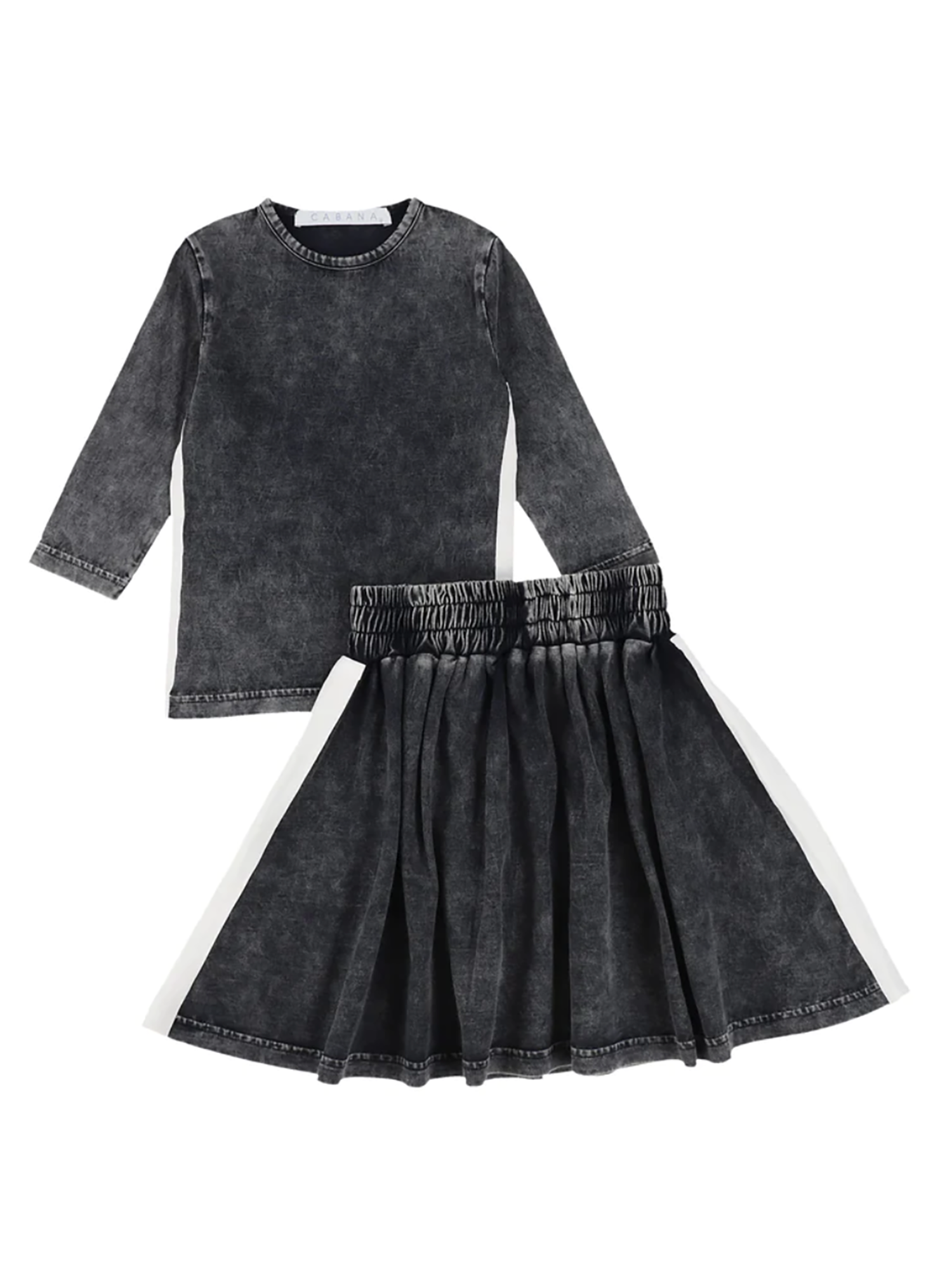 Crewneck long sleeve ribbed shirt with gold stud detail Matching skirt available 97% Cotton 3% Spandex Machine wash cold inside...