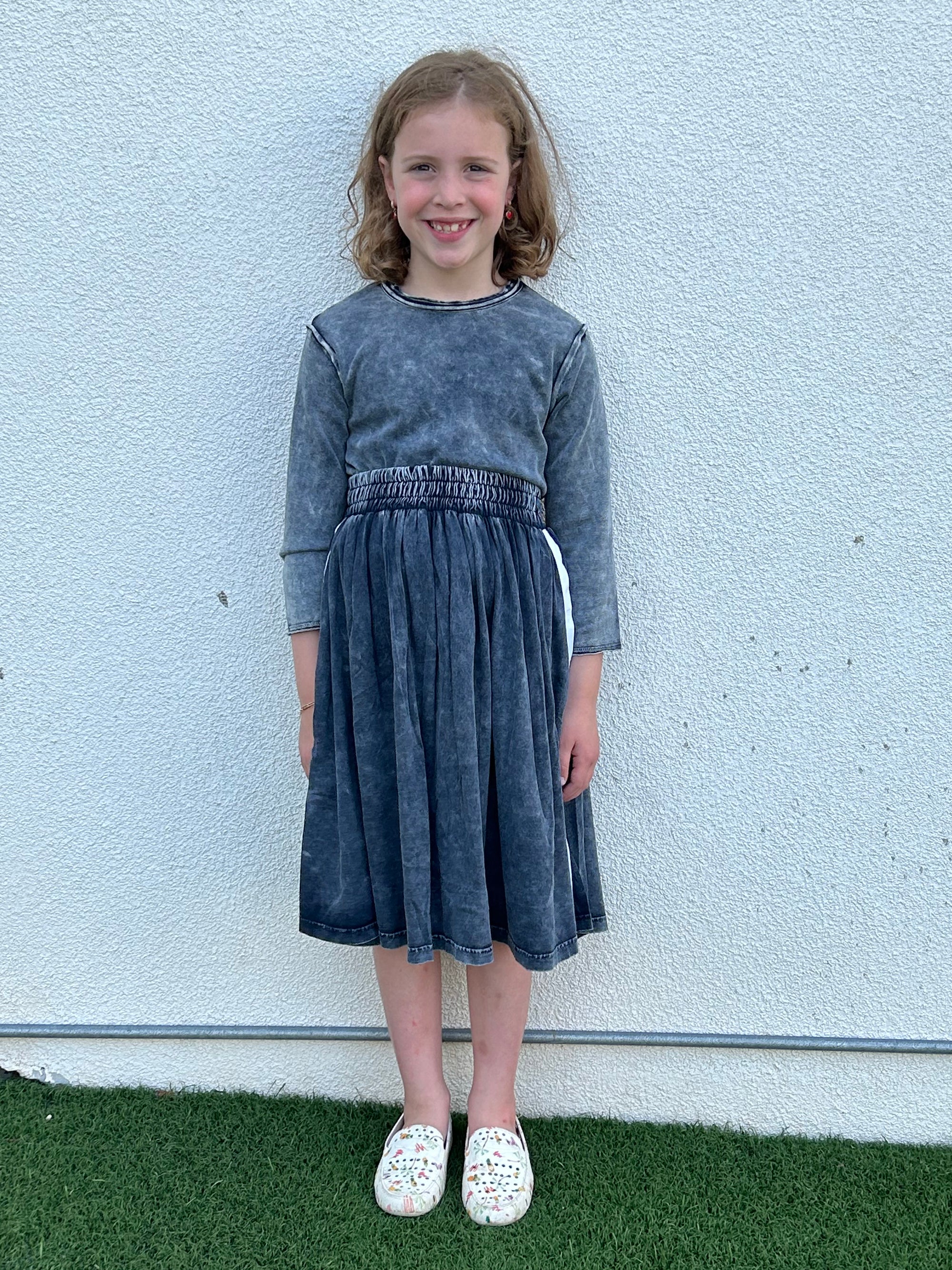 Long-sleeved dress with button closure and a cute skirt. The length of the dress goes above the knee Rib knitted...