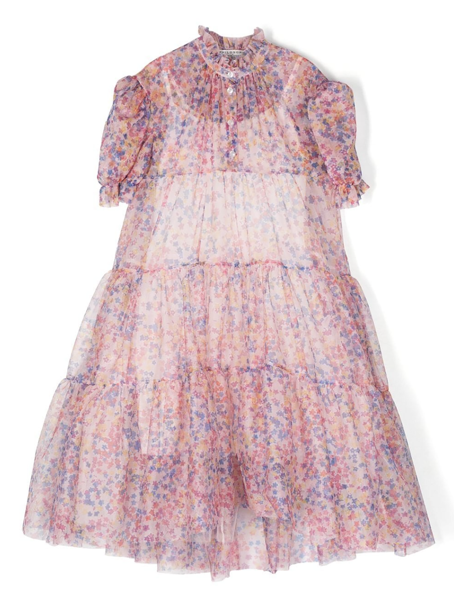 •LOOK: A party girl’s party dress. Layers of netting under a sheer overlay in a floral print. Buttons in back allow easy pull...