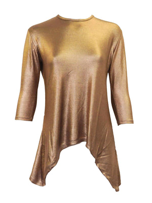 – Sold OutBring out the fun and flirty vibes to your next look with the new Handkerchief Abgin Metallic Top. It is gold in color and features a crewneck, and 3/4 sleeves. Making it an ideal metallic gold top to customize with accessories. (Top is longer on sides).