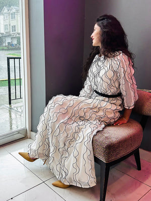 •LOOK: A Pink Orchid exclusive piece. We have a gown that shows a lot of personality and style just waiting for its forever owner. The material is mesh, brilliantly manipulated for a highly texturized and multi dimensional appearance. The mesh is not smooth to the touch and is solidly backed in the same color. The way the mesh fabric has been handled creates a frilly, feminine look that is punctuated with a sharp, contrasting outline of color for visual interest. There is a back zipper and long sleeves. The neckline is slightly rounded. No jewelry is necessary but if you insist, keep it minimal. A small satin belt at the gently shaped waist. This piece is different, eye-catching and perfect for a fashionista who's not afraid to make a daring entrance. It's a special piece for a special occasion made for just the right person.