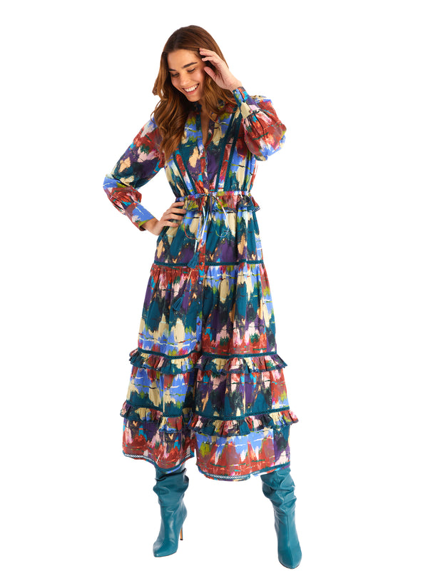 •LOOK: A rich warm palette of blues and burgundies create the backdrop for this maxi length long sleeve dress. Workable buttons straight down the middle and a drawstring waist for shaping adds to its ease and comfort. Subtle ruffle around the neck leads to a V in the front. It is fully lined  with open knitting for detail throughout the body. It is the look of the season, great with boots and a denim jacket.