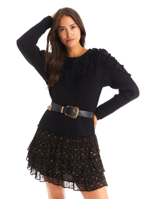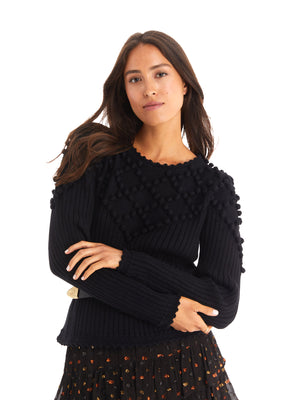 •LOOK: This new Allison New York sweater is perfection; adorned with intricate pom pom detailing throughout the upper neck and sleeve. Designed with a crochet trimmed neckline , cuff and waistline. Pairs perfectly with a fun designed bottom or a simple black skirt.
