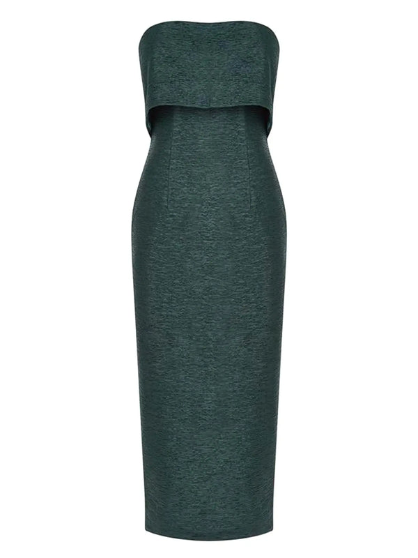 Emerald Green strapless midi dress with structured overlay top. Textured fabric with lustre finish. Concealed zip fastening at back.