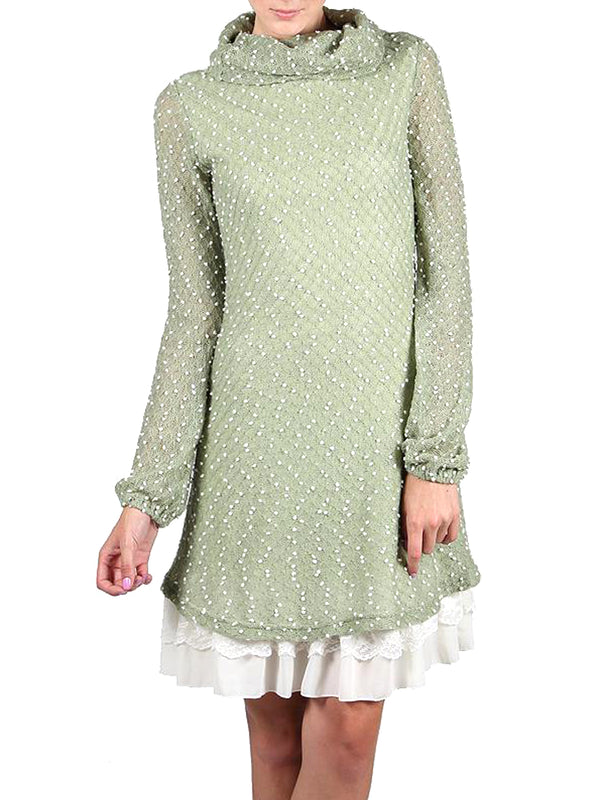 Long sleeve cowlneck knit dress/tunic with cowl neck and polkadots. Lined bodice with tulle/lace cream bottom.