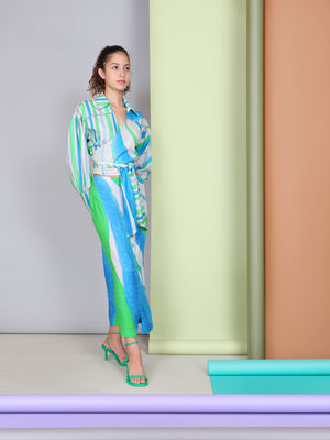 •LOOK: This beautiful top is sublime with its vivid colors of cobalt blue and emerald green. Light grey peeks through here and there. The top has a thick tie that can be knotted in front waist. Mock neck is loose.