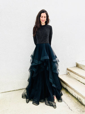 •LOOK: This gown is a striking combination of sophistication and edge. In deep black, it exudes a sense of mystery and allure. Intricately placed beading adorns the bodice, catching and reflecting light in captivating ways. The bodice follows a structured yet flattering design, enhancing the wearer's silhouette. The skirt is where the horsehair comes into play, giving the gown a touch of drama with its voluminous, slightly sculptural layers that cascade to the floor. This gown is a perfect blend of elegance and boldness, making a statement at any formal event.