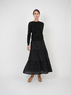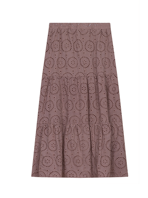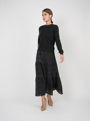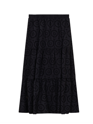 •LOOK: What a great feeling it is when the days get longer and the clothes get lighter. Here is a maxi skirt by Club Malibu that checks a lot of boxes. The elastic waist for easy pull on and comfort. The skirt has three subtle tiers and is fully lined. The outer layer has intentionally placed holes contributing to the airy feel and textured nature. Try pairing this with a fitted T-shirt, a lightweight blouse tied at the waist or the available matching sweater for an updated, monotone look. Slip into your favorite warm weather shoes, grab those sunglasses and go.