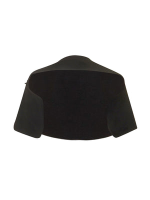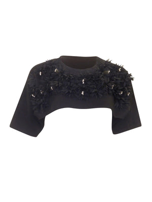 Sleeveless pullover shrug with tulle floral applique and diamond, crystal studs. Cropped with crew-neck line.