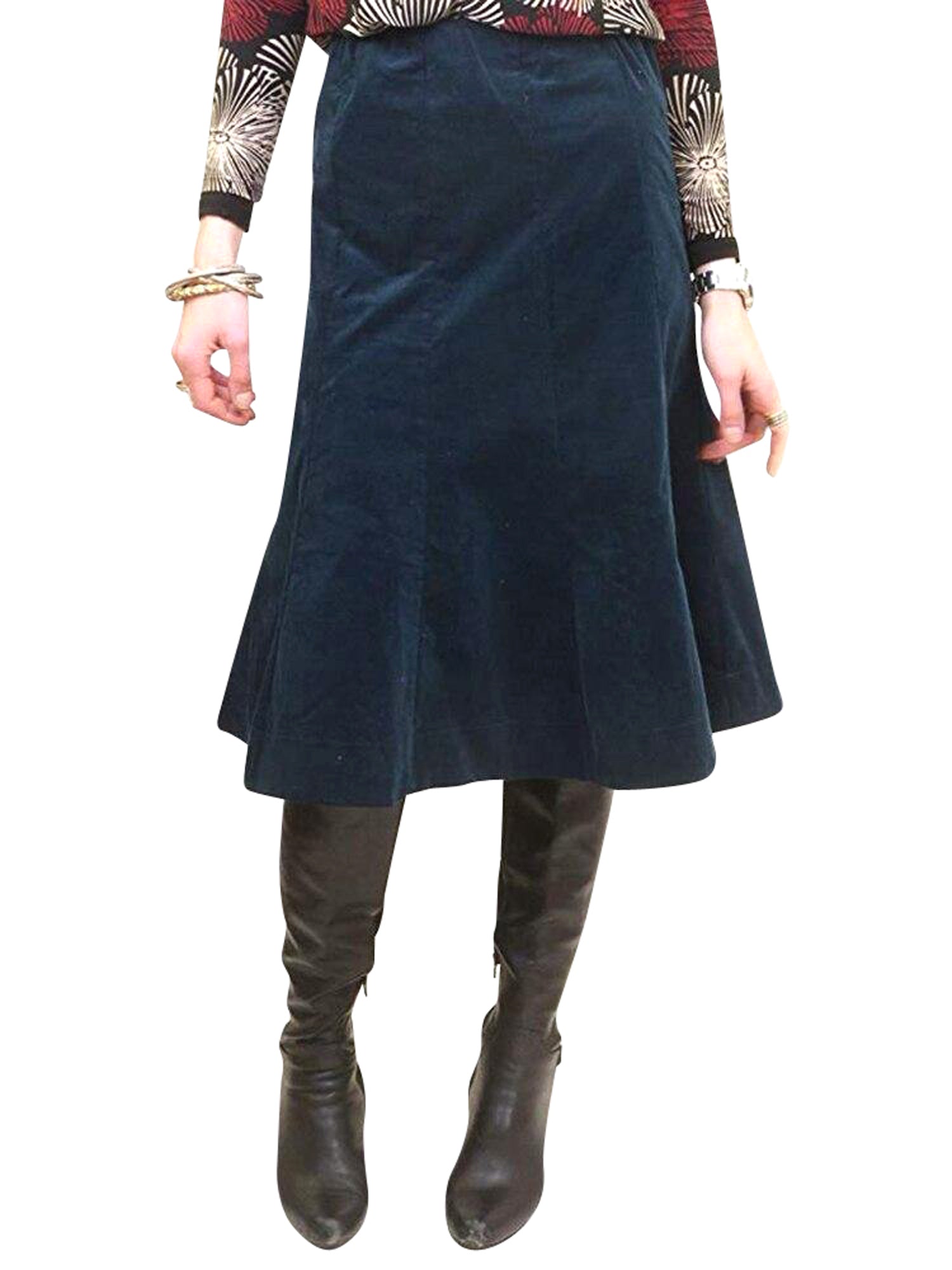 Corduroy stretch a-line skirt with elastic waistband. Sizing runs small as it fits for juniors/teens.