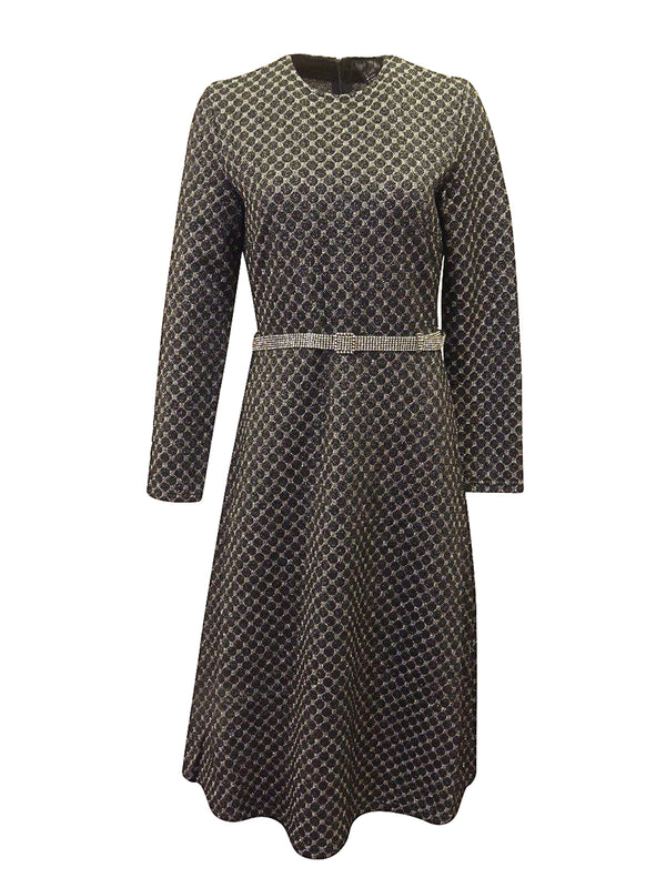 Crew-neck long sleeve knit a-line dress with black and metallic silver circle print. Fit and flare body.