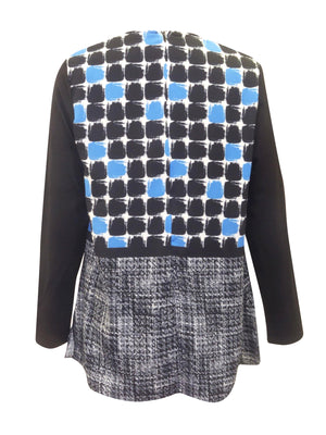 Long sleeved crew-neck blouse with black bodice and knit geometric print overlay with peak-a-boo opening in front. pattern mix-matching with blue, white and black.