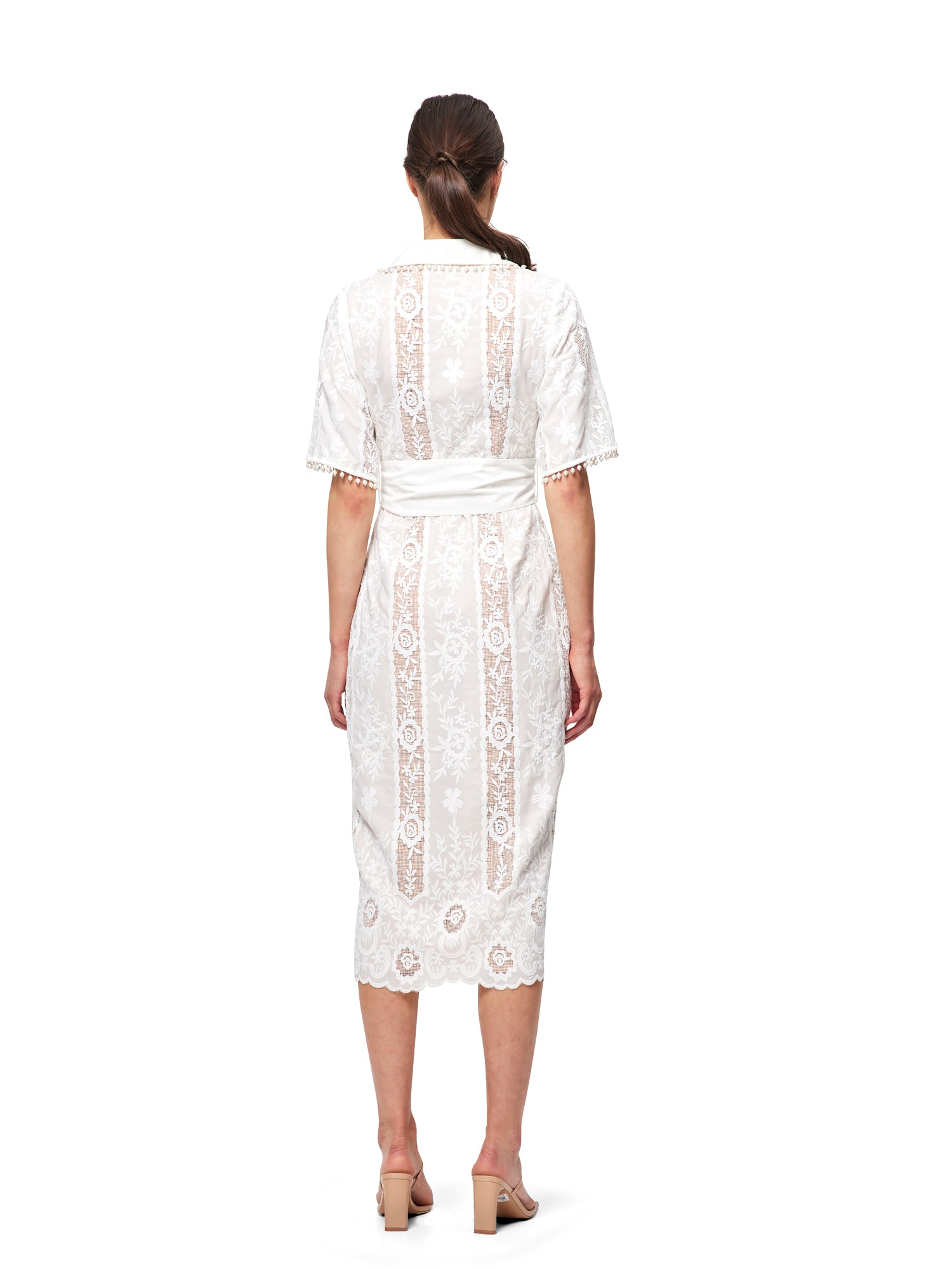 features a collared, short-sleeved bodice and scalloped midi skirt, tied at the waist with a tone-on-tone belt.