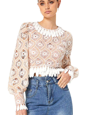 •LOOK: The Somatic Top by Elliatt is a special piece to add to your wardrobe. Brimming with delicate details of embroidered lace throughout. The Somatic Top features slightly puffed sleeves, and beautiful round neckline and cuffing detailing.