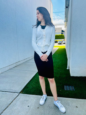 The waisted cardigan style gives an elegant silhouette while the gold buttons add a touch of luxury and sophistication. The v-neck design of the cardigan enhances the overall look of the outfit, providing a liberating feel and making it more appealing to women who prefer clothes that are both stylish and comfortable.