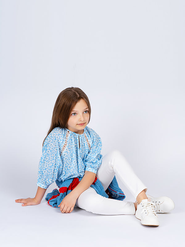 •LOOK: New from Ermanno Scervino is a whisper soft top your fashionista will wear all season. It is meant to be worn outside the waistband. There is a rounded neckline with a button and keyhole closure in front. The fabric is adorned with refreshing daisies. The full sleeves are three-quarter length with a button closure. The designer's signature open weave is visible from front and back framing each arm. The top is so soft to the touch she will barely feel it on. Perfect with blue or white denim bottoms. Also looks great with a cotton summer skirt. Ideal piece for any daytime event she may have on her social calendar this season.