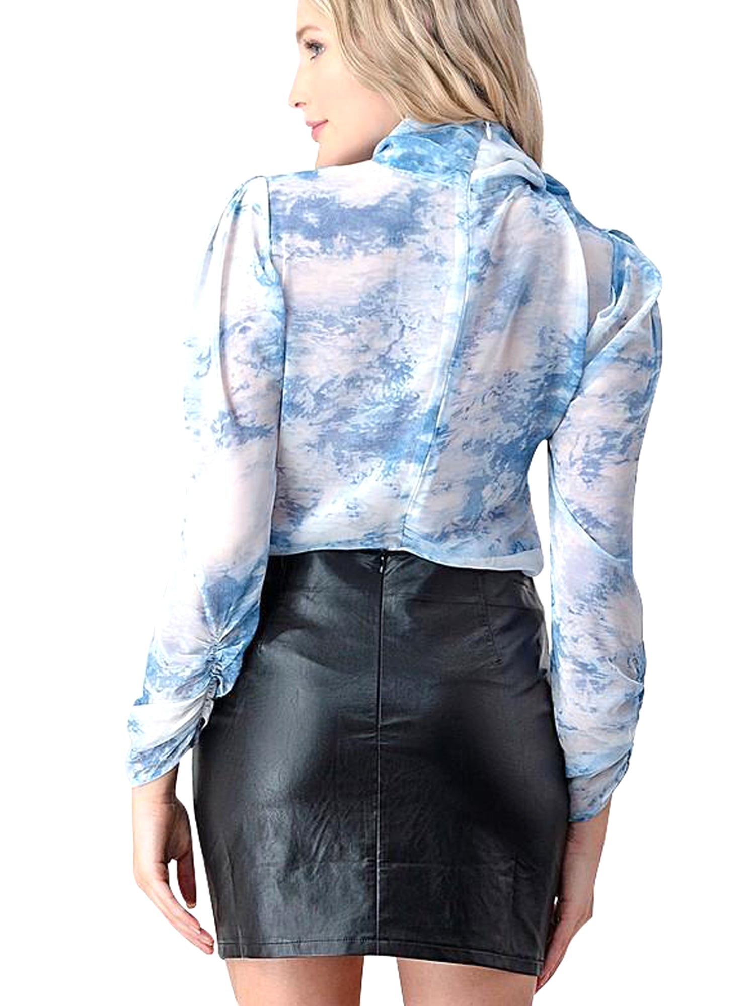Chiffon semi-sheer tie dye scarf blouse with long ruched/puff sleeves and back zipper closure.100% Polyester