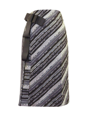 Pencil skirt with black grey and silver diagonal stripes. Black ribbon bow with pearl accent on right side with narrow horizontal panel. Stripes go down on right side and back of skirt.