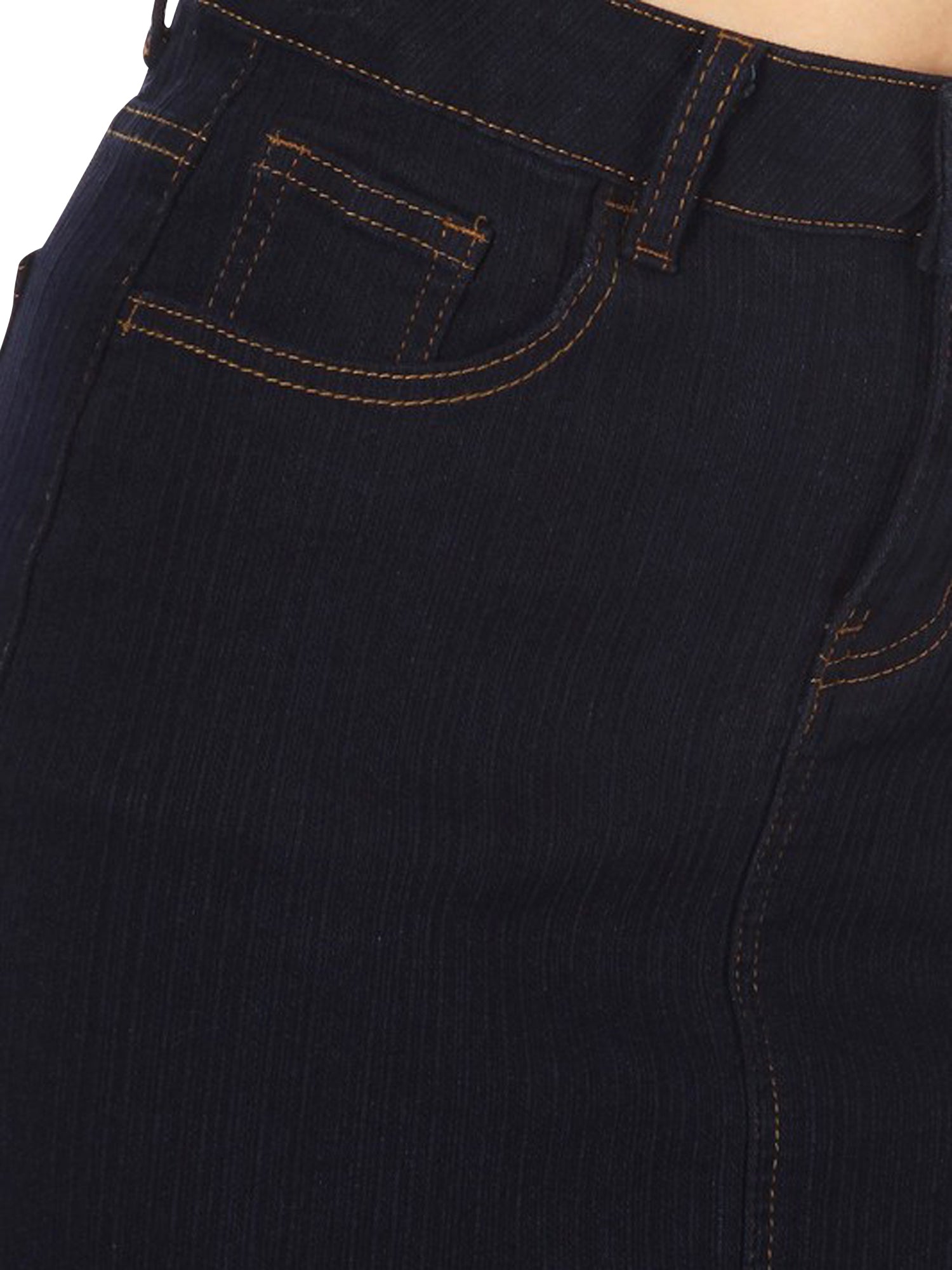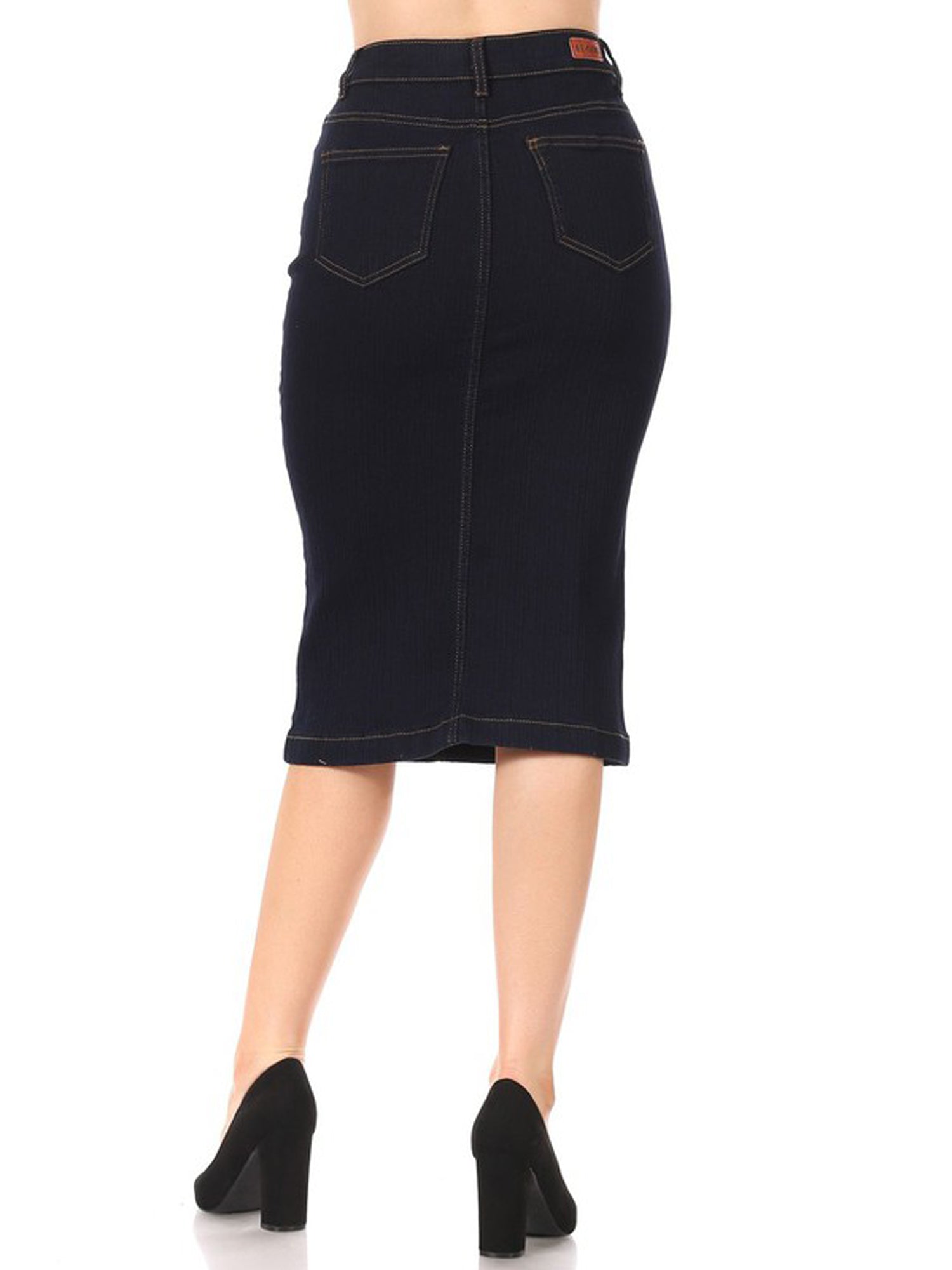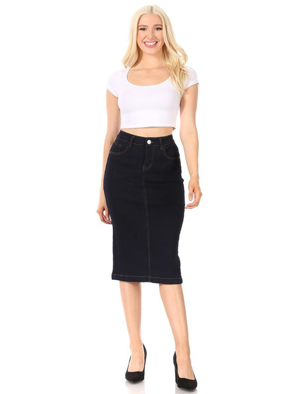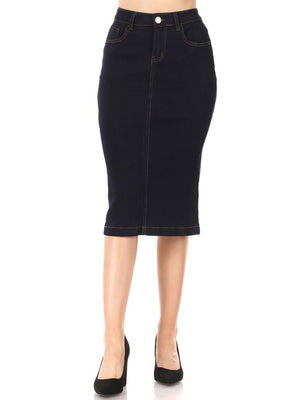 Be-Girl brand - stretch denim solid calf-length pencil skirt, no slit, back length 28"L. Waist: 27.5"- 29.5"- 31.5"- 34"- 36.5" Hip: 34.5"- 36.5"- 38.5"- 41"- 43.5"