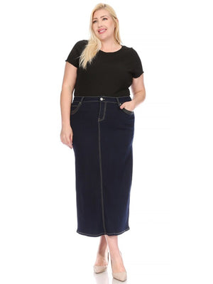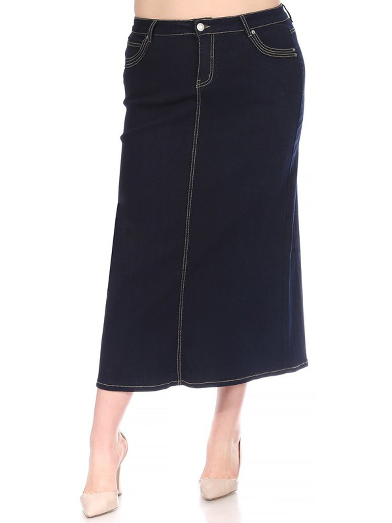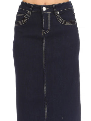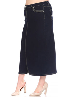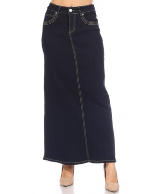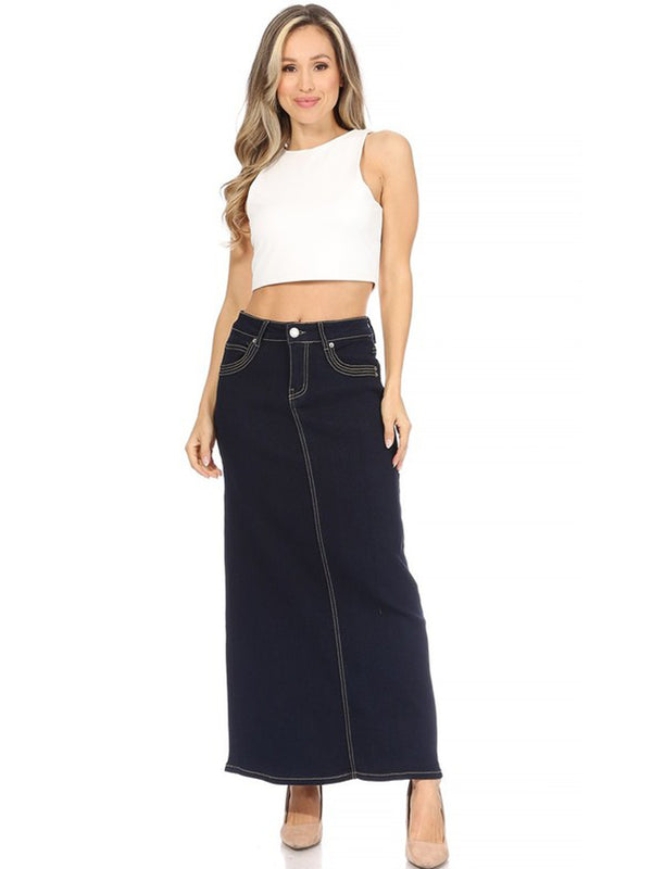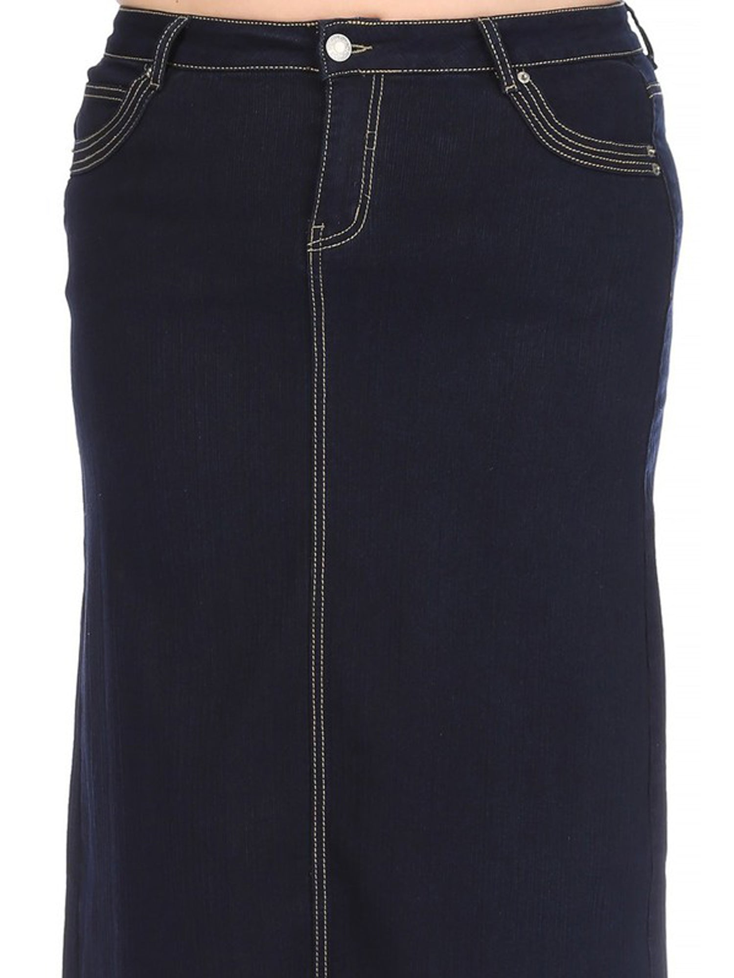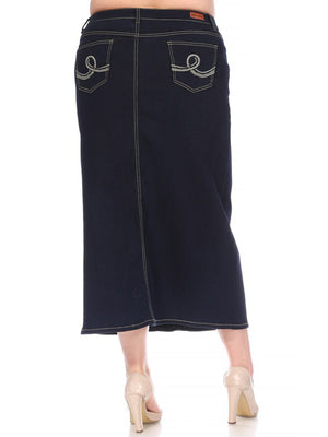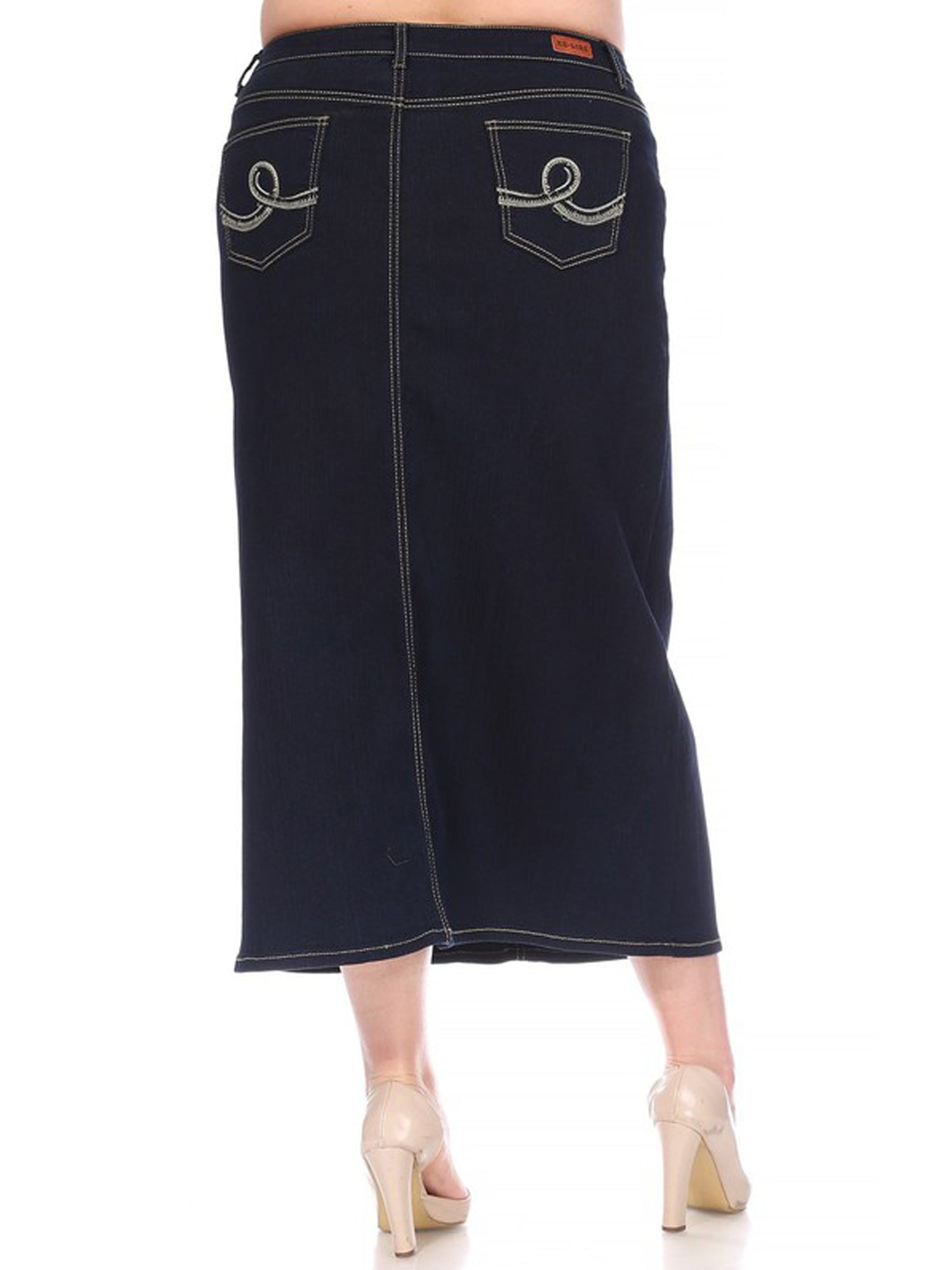 Stretch denim long skirt with embroidery embellished, no slit, back length 38". Waist: 27.5"- 29.5"- 31.5"- 34"- 36.5" Hip: 34.5"- 36.5"- 38.5"- 41"- 43.5"