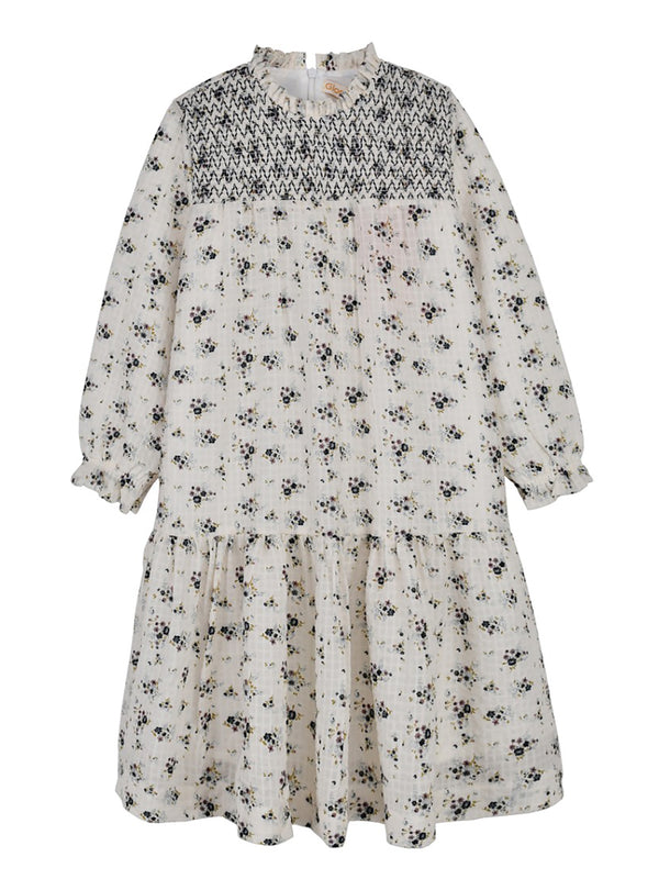 •LOOK: A sweet dress in crepe is just what she needs for your next big event of the season. There is a hidden zipper in the back that closes to a rounded neckline with a little ruffle to frame her face. Smocking effect on the front yoke in a contrasting pattern gives dimension and texture. The little tier at the bottom gives flouncy movement when she dances. Long sleeves. Fully lined.