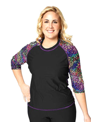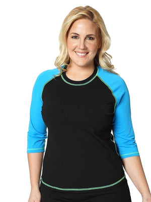 – Sold OutThis chlorine proof & modest 3/4 sleeve swim and running shirt is designed for all outdoor activities. Look and feel fabulous while protecting your skin from the sun. Great for a day at the pool or water park. This top has the right length in the torso to keep you covered and doesn't ride up as you move.